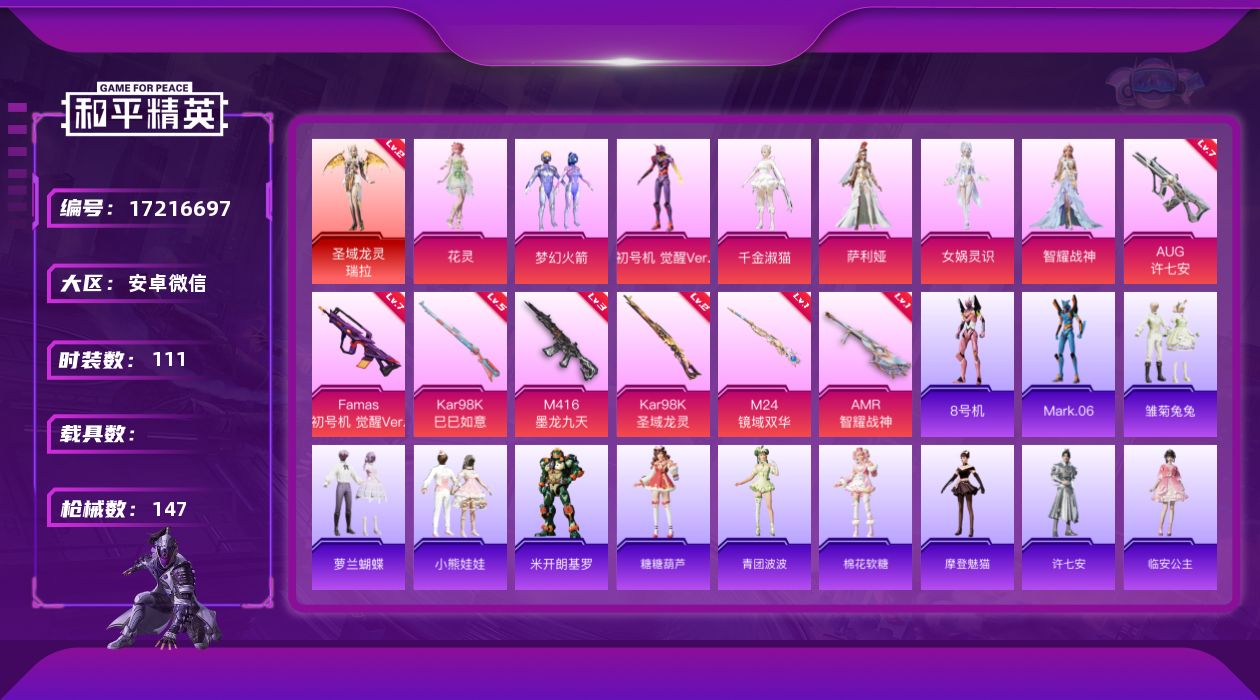 [17216697]【店主推荐捡漏号!可直接换绑】安卓 微信-1神装-7粉装-7特效枪-0载具-5粉色飞行器-52216热力值-10王牌印记-111套装-147枪皮【红色神装等级】:圣域龙灵-瑞拉(二级)【红色角色神装】:圣域龙灵-瑞拉【热门品类】:粉装-梦幻火箭,角色-8号机,角色-Mark.06【粉色套装】:粉装-梦幻火箭,角色-初号机 觉醒Ver.,角色-千金淑猫,角色-萨利娅,角色-女娲灵识,角色-智耀战神,角色-花灵【粉色枪皮等级】:M416-墨龙九天(三级),AUG-许七安(七级),Famas-初号机 觉醒Ver.(七级),Kar98K-巳巳如意(五级),Kar98K-圣域龙灵(二级),M24-镜域双华(一级),AMR-智耀战神(一级)【粉色枪皮】:M416-墨龙九天,AUG-许七安,Famas-初号机 觉醒Ver.,Kar98K-巳巳如意,Kar98K-圣域龙灵,M24-镜域双华,AMR-智耀战神【粉色飞行器】:炫彩糖果飞行器,沙丘之主天马,镜域双华-灵镜之阶,龙翔九天飞行器,圣域金龙飞行器