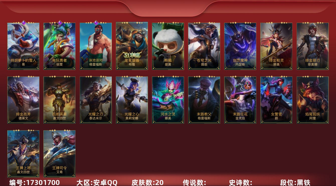 [17301700]50英雄-20皮肤 【史诗皮肤】:持胡萝卜的雪人 易,泳池派对 格雷福斯,电玩勇者 锐雯 【赛季皮肤】:s1光耀之刃,s4光耀之心,s6绯金丽刃,s7绯金战斧,s8绯金鮫灵,s10王牌上将,s11王牌司令,s13龙冕御盾 【其他皮肤】:苍穹之光 薇恩,光耀之心 奥莉安娜,光耀之刃 泰达米尔,末路狂花 金克丝,龙冕御盾 布隆,绯金丽刃 菲奥娜,焰尾妖狐 阿狸,熊猫 提莫,女警官 蔚,孤胆英豪 嘉文四世,王牌上将 嘉文四世,创世魔神 内瑟斯,末路教父 格雷福斯,绯金战斧 德莱文,王牌司令 艾希,河水之灵 娜美,绯金鲛灵 娜美