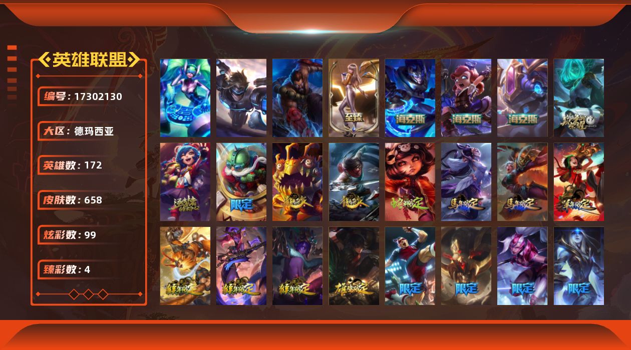 [17302130]未定级段位-172英雄-658皮肤-99炫彩-3终极-6神话-120限定-55传说-177史诗
