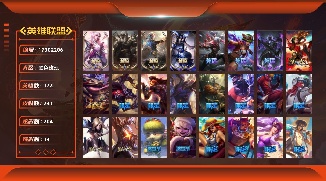 [17302206]未定级段位-172英雄-231皮肤-204炫彩-0终极-9神话-25限定-20传说-36史诗