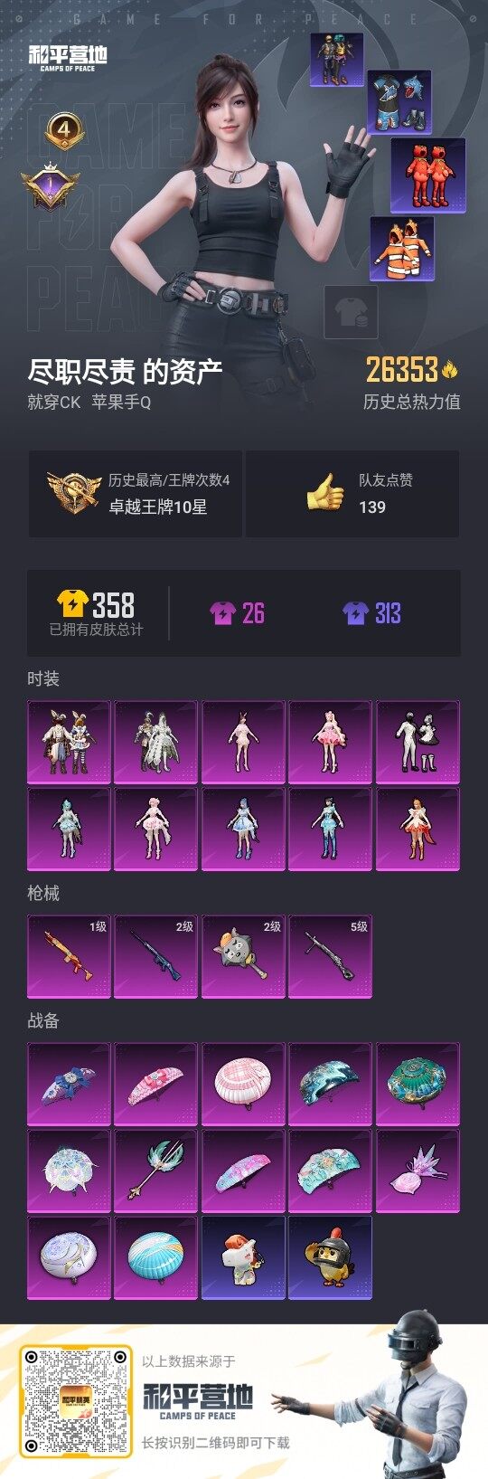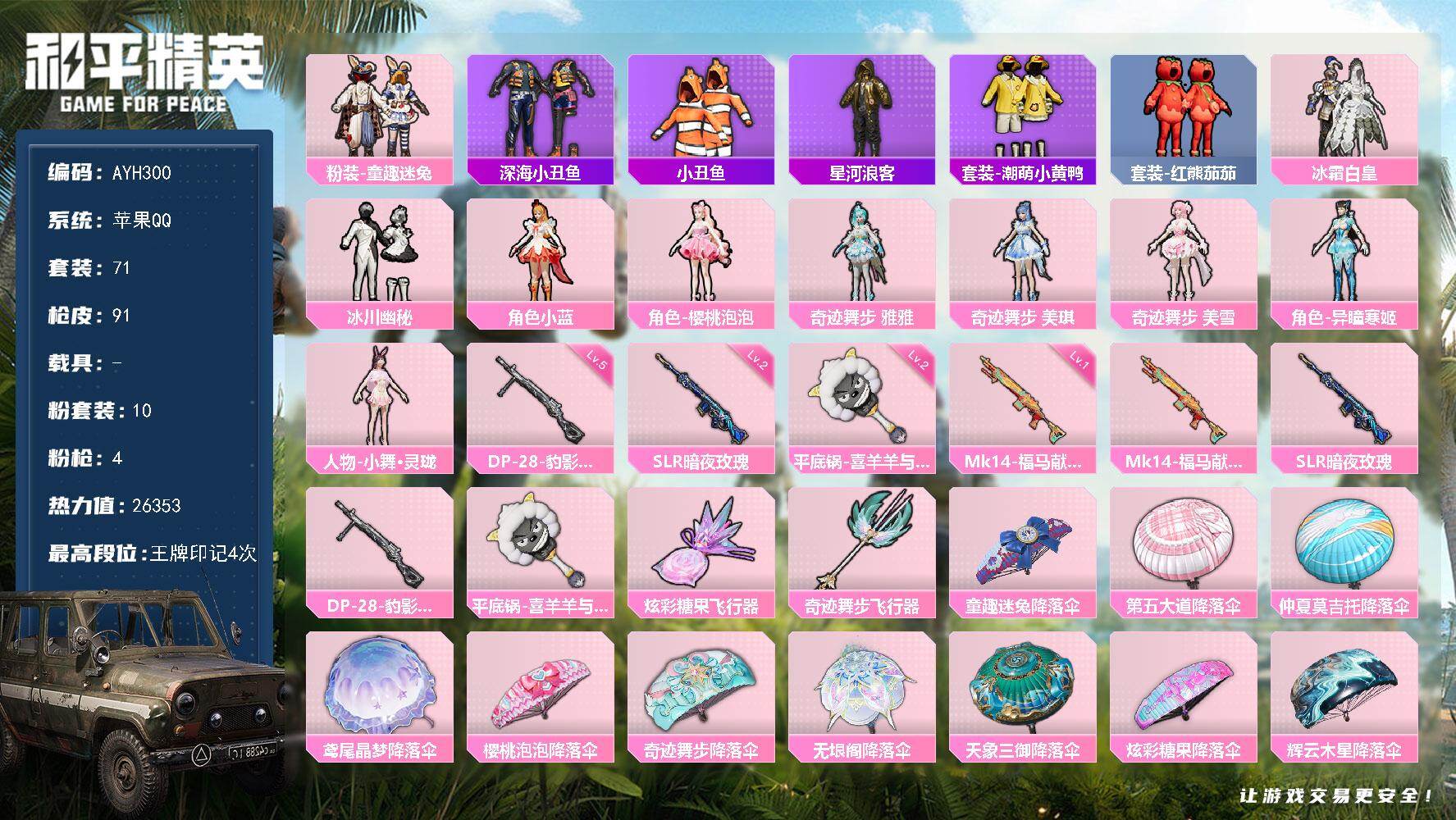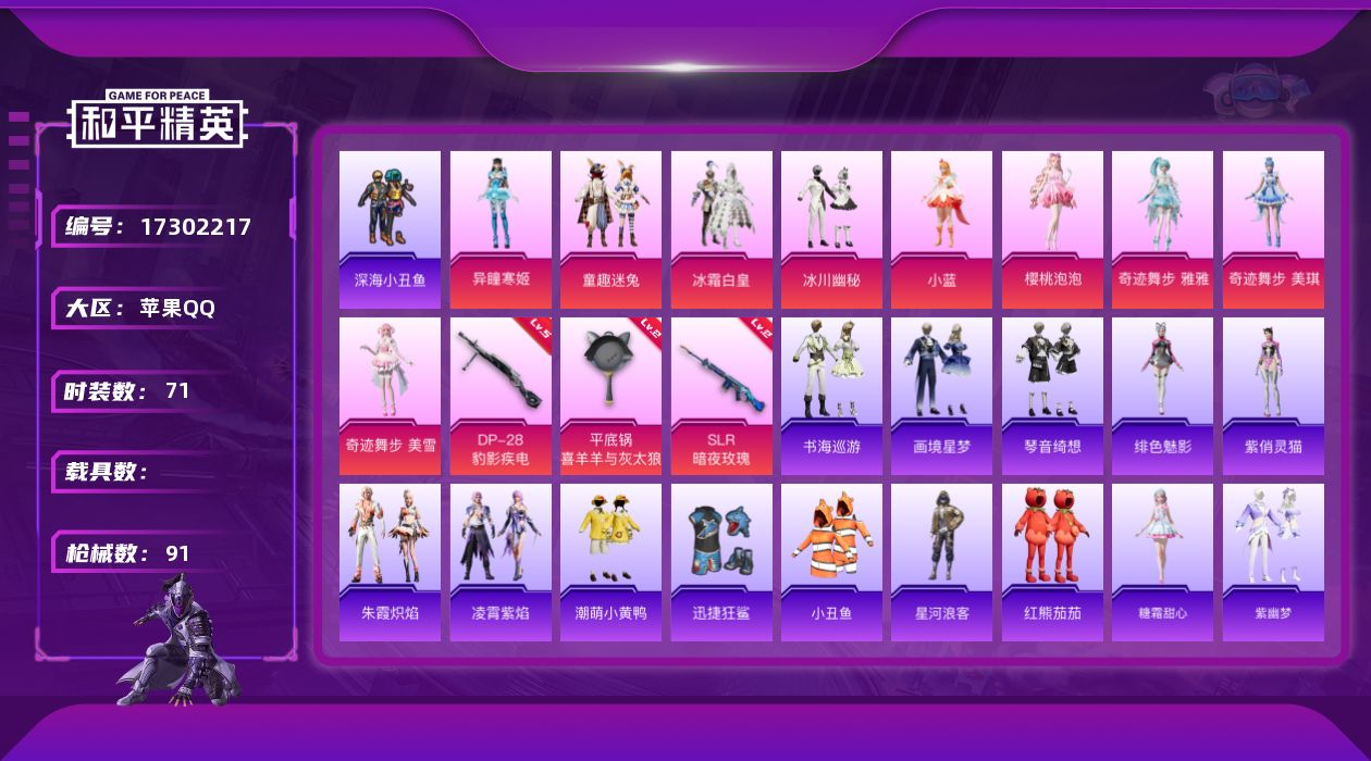 [17302217]苹果 手Q-10粉装-4特效枪-0载具-2粉色飞行器-26353热力值-4王牌印记-71套装-91枪皮【热门品类】:粉装-童趣迷兔,套装-深海小丑鱼,套装-小丑鱼,套装-星河浪客,套装-潮萌小黄鸭,套装-红熊茄茄【粉色套装】:粉装-冰霜白皇,粉装-童趣迷兔,粉装-冰川幽秘,角色-小蓝,角色-樱桃泡泡,角色-奇迹舞步 雅雅,角色-奇迹舞步 美琪,角色-奇迹舞步 美雪,角色-异瞳寒姬,人物-小舞·灵珑【粉色枪皮等级】:Mk14-福马献瑞(一级),SLR-暗夜玫瑰(二级),DP-28-豹影疾电(五级),平底锅-喜羊羊与灰太狼(二级)【粉色枪皮】:Mk14-福马献瑞,SLR-暗夜玫瑰,DP-28-豹影疾电,平底锅-喜羊羊与灰太狼【粉色飞行器】:炫彩糖果飞行器,奇迹舞步飞行器