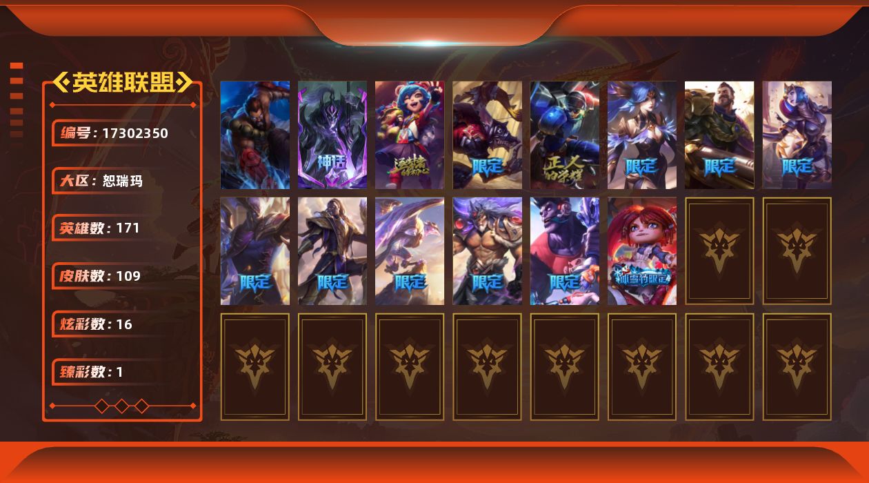 [17302350]【特价出售/店主推荐】黄金段位-171英雄-109皮肤-16炫彩-1终极-2神话-14限定-11传说-37史诗