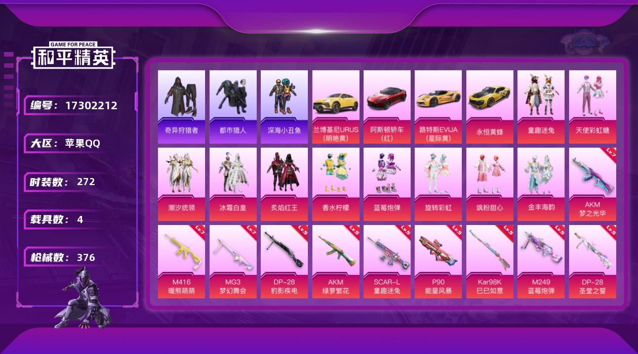 [17302212]苹果 手Q-无敌战神框-10粉装-13特效枪-4载具-3粉色飞行器-123294热力值-13王牌印记-272套装-376枪皮