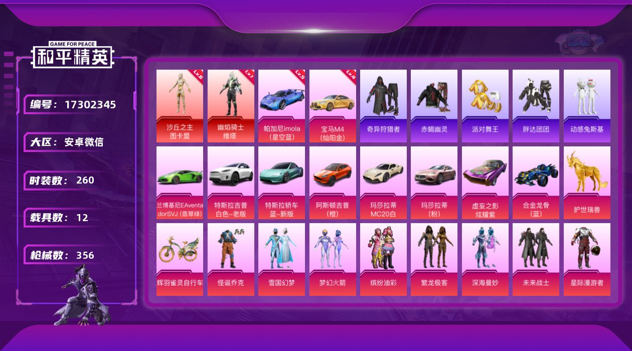 [17302345]【特价出售/店主推荐】安卓 微信-2神装-31粉装-36特效枪-12载具-21粉色飞行器-186582热力值-13王牌印记-260套装-356枪皮 【红色载具】:帕加尼imola(星空蓝)(五级),宝马M4(灿阳金)(四级) 【红色神装等级】:幽焰骑士-维塔(一级),沙丘之主-图卡盟(六级) 【红色角色神装】:幽焰骑士-维塔,沙丘之主-图卡盟 【热门品类】:粉装-怪诞乔克,粉装-雪国幻梦,粉装-梦幻火箭,粉装-缤纷油彩,粉装-繁龙极客,套装-赤蝎幽灵,套装-派对舞王,套装-小丑鱼,套装-奇异狩猎者,套装-胖达团团,套装-金羽特工,套装-动感兔斯基人偶服,套装-AG战队服,套装-暗影哥特,套装-浪漫波比,角色-六号稻草人,熔岩游骑兵连帽夹克 【粉色套装】:粉装-深海曼妙,粉装-未来战士,粉装-星际漫游者,粉装-怪诞乔克,粉装-甜心巧克力,粉装-宝贝奶油派,粉装-天使彩虹糖,粉装-雪国幻梦,粉装-蝶舞迷情,粉装-梦幻火箭,粉装-金风玉露,粉装-金属狂野,粉装-缤纷油彩,粉装-天禅智恒,粉装-潮汐统领,粉装-草莓生巧,粉装-香水柠檬,粉装-冰川粉黛,粉装-冰川幽秘,粉装-第五大道,角色-白勺歌姬,角色-呆萌星弥,角色-小可学妹,粉装-繁龙极客,角色-烟云彩露,粉装-动力核心,角色-智慧纱织,粉装-星穹咏叹调,粉装-湮灭星辰,角色-狂魅哈莉,角色-绯穹魔姬 【粉色枪皮等级】:AKM-甜心宝贝(六级),AKM-炫紫旋律(一级),AKM-幽焰骑士(三级),SCAR-L-梦幻火箭(四级),SCAR-L-金蛇镇世(三级),M416-五爪金龙(一级),M416-心之恋语(五级),M416-墨龙九天(九级),GROZA-香水柠檬(四级),GROZA-镜光银凌(五级),AUG-暖羊咩咩(五级),M762-甜蜜誓约(五级),M762-激战未来(七级),汤姆逊-星月云朵(二级MK12-雪月幻音),AKS-74U-星穹咏叹调(二级),P90-沙丘之主(三级),Kar98K-伏魔团(四级),Kar98K-巳巳如意(五级),Kar98K-圣域龙灵(三级),M24-星之信仰(七级),AWM-花间之火(一级),AWM-湮灭星辰(五级),Mini14-荧光虫舞(四级),Mk14-盛世惊鸿(三级),AMR-鸢尾晶梦(四级),M200-伏羲圣卦(四级),SVD-月影灵韵(五级),DP-28-扶摇飞仙(五级