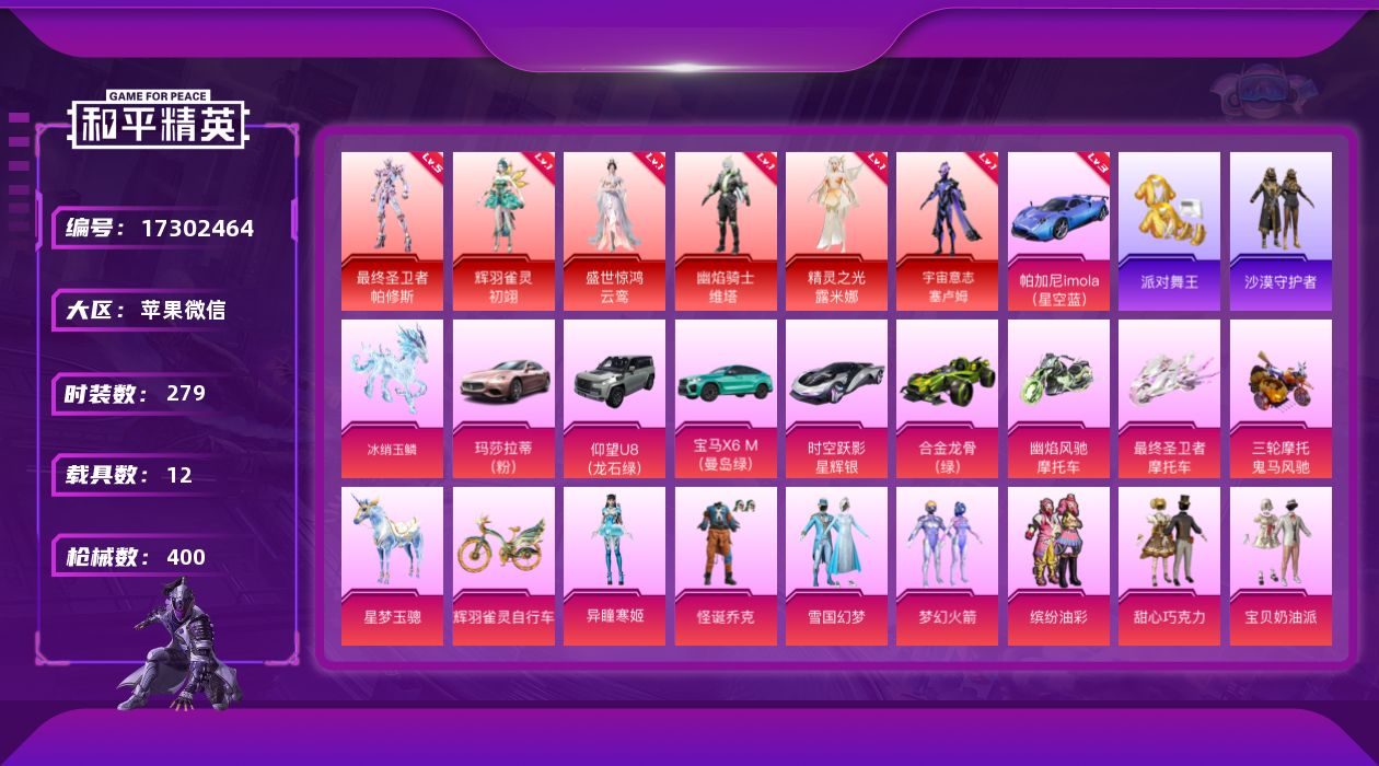 [17302464]【特价出售/店主推荐】苹果 微信-无敌战神框-6神装-40粉装-27特效枪-12载具-24粉色飞行器-170836热力值-18王牌印记-279套装-400枪皮