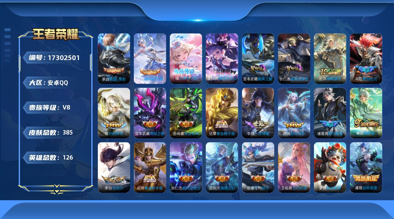 [17302501]【特价出售/店主推荐,打野50段,,1省标,7市标】,安卓Q-V8-最强王者段位-126英雄-385皮肤-2典藏皮肤-2珍品传说-22传说-2星传说-115史诗
