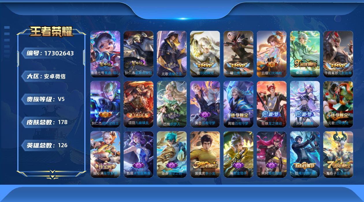 [17302643]安卓WX-V5-126英雄-177皮肤-7传说-48史诗-2星元