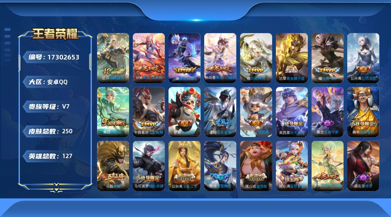 [17302653]【特价出售/店主推荐】安卓Q-V7-至尊星耀III段位-127英雄-250皮肤-13传说-60史诗