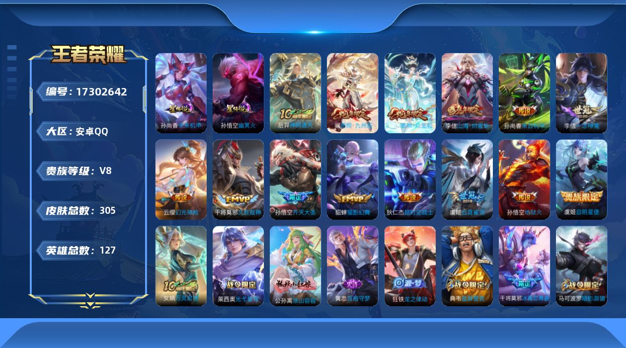 [17302642]可二次【特价出售/店主推荐】安卓Q-V8-最强王者段位-127英雄-305皮肤-1典藏英雄-2星传说-14传说-85史诗