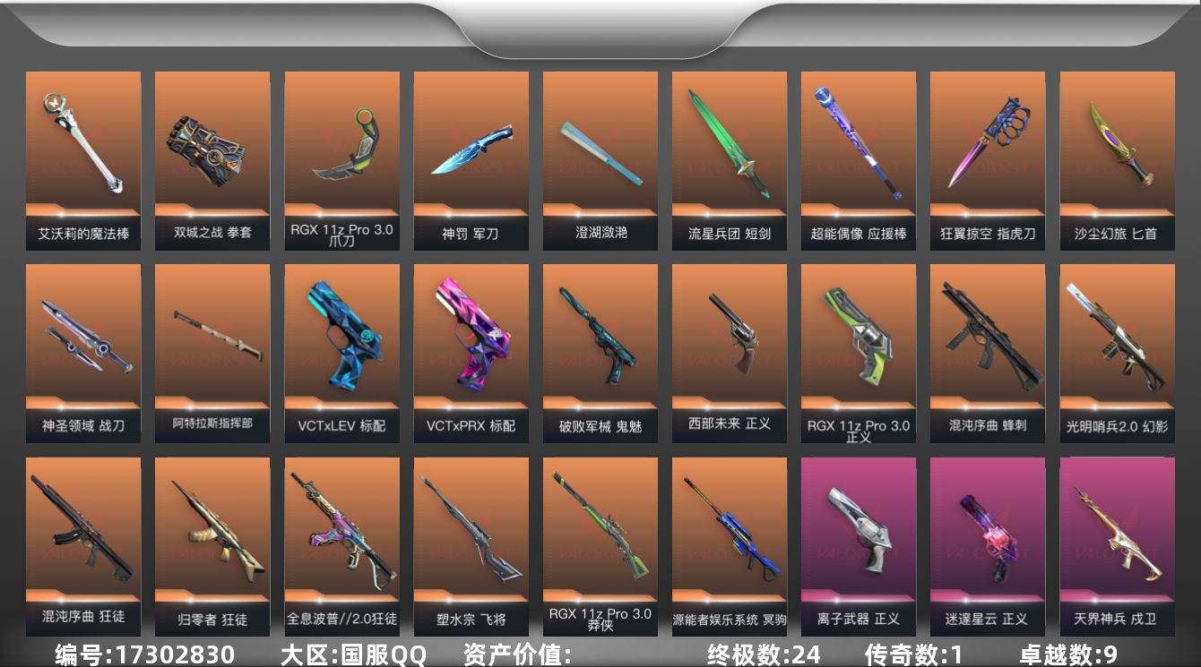 [17302830]【套装】:RGX 11z Pro//3.0套装,狂翼掠空套装 【英雄】:幻棱,炼狱,维斯,暮蝶,钛狐,壹决,铁臂,捷风,雷兹,幽影,不死鸟,贤者,猎枭,蝰蛇,零,芮娜,奇乐,尚勃勒,霓虹,斯凯,夜露,星礈,K/O,海神,盖可,黑梦,钢锁 【近战武器】:近战武器-RGX 11z Pro//3.0 爪刀,近战武器-艾沃莉的魔法棒,近战武器-澄湖潋滟,近战武器-双城之战 拳套,近战武器-流星兵团 短剑,近战武器-超能偶像 应援棒,近战武器-狂翼掠空 指虎刀,近战武器-沙尘幻旅 匕首,近战武器-神罚 军刀,近战武器-天御刀,近战武器-神圣领域 战刀,近战武器-阿特拉斯指挥部 甩棍 【狂徒】:狂徒-归零者,狂徒-混沌序曲,狂徒-全息波普//2.0,狂徒-盖亚的复仇,狂徒-海洋之星,狂徒-起源,狂徒-超能偶像,狂徒-狂翼掠空,狂徒-流星兵团,狂徒-沙尘幻旅,狂徒-彩虹魔力小白马 【幻影】:幻影-光明哨兵//2.0,幻影-侦察力量,幻影-神圣领域,幻影-聚合之力 【戍卫】:戍卫-天界神兵,戍卫-超能偶像,戍卫-浮光跃金,戍卫-萌彩剪影,戍卫-战术熊与伙伴们,戍卫-月球哨兵 【獠犬】:獠犬-漫天彩霞,獠犬-神圣领域,獠犬-采蜜小蜂队,獠犬-胡桃狂想,獠犬-模拟赫兹 【冥驹】:冥驹-源能者娱乐系统,冥驹-胡桃狂想,冥驹-模拟赫兹,冥驹-星云暗涌 【飞将】:飞将-塑水宗,飞将-沙尘幻旅,飞将-聚合之力,飞将-战术熊与伙伴们 【莽侠】:莽侠-RGX 11z Pro//3.0,莽侠-超限闪存,莽侠-纤云弄巧,莽侠-月球哨兵 【战神】:战神-迷邃星云,战神-神圣领域,战神-采蜜小蜂队,战神-浮光跃金,战神-萌彩剪影 【奥丁】:奥丁-紫阙金琅//2.0,奥丁-狂翼掠空,奥丁-流星兵团,奥丁-神罚 【判官】:判官-超能偶像,判官-浪漫雪国,判官-采蜜小蜂队,判官-萌彩剪影 【雄鹿】:雄鹿-狂翼掠空,雄鹿-模拟赫兹,雄鹿-月球哨兵 【骇灵】:骇灵-流星兵团,骇灵-沙尘幻旅,骇灵-无限竞技,骇灵-浮光跃金,骇灵-沙场老兵,骇灵-星云暗涌 【蜂刺】:蜂刺-混沌序曲,蜂刺-超限闪存,蜂刺-胡桃狂想,蜂刺-聚合之力,蜂刺-纤云弄巧,蜂刺-星云暗涌 【标配】:标配-超能偶像,标配-浮光跃金,标配-战术熊与伙伴们 【VCT手枪】:标配-VCT x LEV,标配-VCT x PRX 【正义】:正义-RGX 1