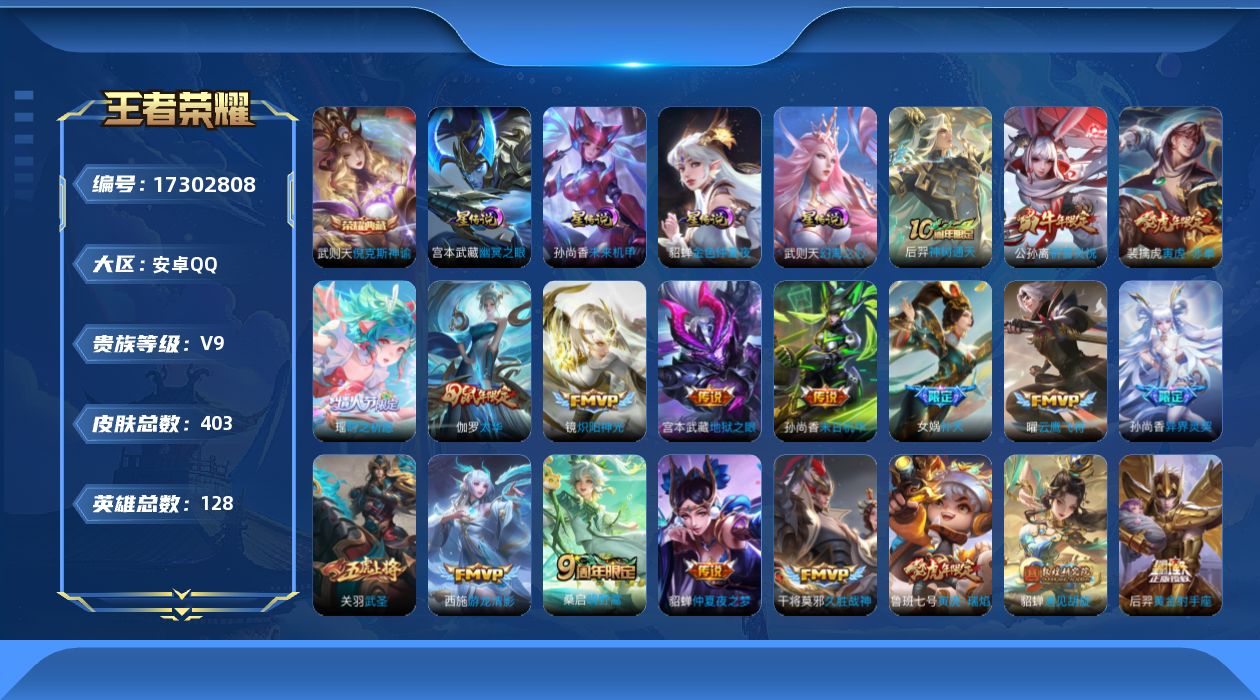 - PX_2088151-实名: 可修改 贵族等级: V7 英雄数: 122 皮肤数: 242 传说皮: 黄金射手座,挚爱之约,神器·狴犴令,山海·炽霜斩,燃星之曲,浮生妄,幻光神枪 限定皮: 李小龙,奔雷神使,梁祝,龙胆,寅虎·御盾,武陵仙君,高山流水,猪悟能,时之祈愿-云中君,时之祈愿-瑶,百木心枪,玉兔公主,匿光决锋者,深海之息,五谷丰年,鸣野蒿,逐霄战戟,愿照·山河定