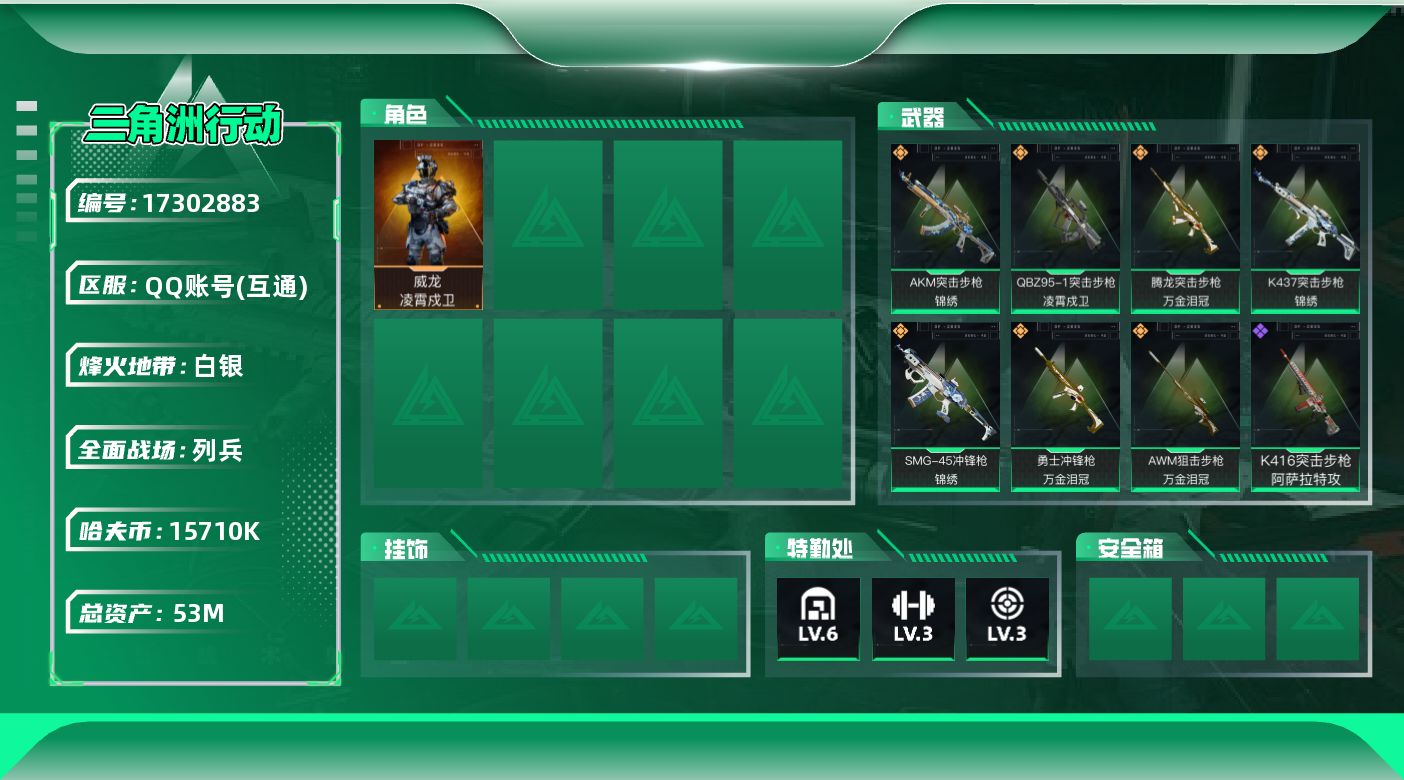 [17302883]【特价出售/店主推荐】53m总资产-15710k哈伏币-34烽火等级-白银-9战场等级-列兵 【干员外观】:威龙-凌霄戍卫 【近战皮肤】:近战-黑鹰 【传说外观】:AKM突击步枪-锦绣,QBZ95-1突击步枪-凌霄戍卫,腾龙突击步枪-万金泪冠,K437突击步枪-锦绣,SMG-45冲锋枪-锦绣,勇士冲锋枪-万金泪冠,AWM狙击步枪-万金泪冠 【史诗外观】:K416突击步枪-阿萨拉特攻,G3战斗步枪-哈夫克警备,PKM通用机枪-阿萨拉特攻 【稀有外观】:SG552突击步枪-2026,MP5冲锋枪-弄臣,M1014霰弹枪-幻影结构,QJB201轻机枪-哈夫克卫队,Mini-14射手步枪-荣耀列队 【普通外观】:M4A1突击步枪-高雅黑,M4A1突击步枪-海色,QBZ95-1突击步枪-2026,K416突击步枪-几何迷彩,M7战斗步枪-红色涂装,SCAR-H战斗步枪-数码迷彩,MP5冲锋枪-海色,MP5冲锋枪-黄蜂,Vector冲锋枪-几何迷彩,UZI冲锋枪-海色,野牛冲锋枪-高雅黑,M1014霰弹枪-高雅黑,M249轻机枪-黄蜂,SVD狙击步枪-高雅黑,SR-25射手步枪-黄蜂,G17-2026 【挂饰】:挂饰-凌霄戍卫,挂饰-崩岩重炮*4,挂饰-暗行哨兵,挂饰-牛角,挂饰-关山难越,挂饰-锦绣,挂饰-北非蛋,挂饰-万金泪冠,挂饰-紧急撤离*15