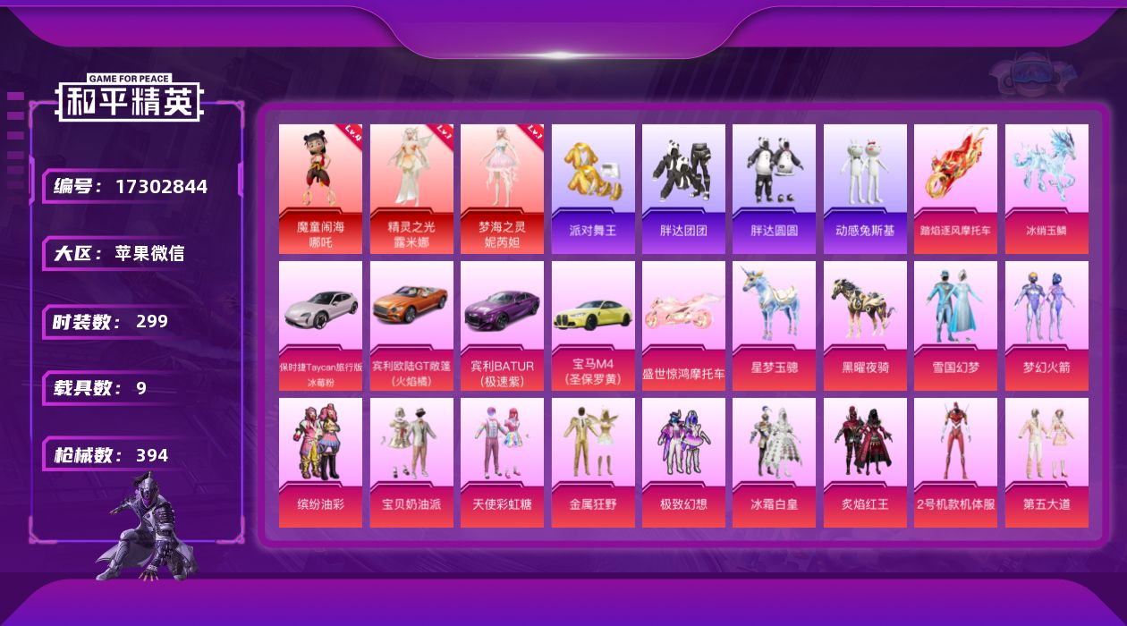 [17302844]9级m4女娲 苹果 微信-3神装-23粉装-26特效枪-9载具-13粉色飞行器-156047热力值-26王牌印记-299套装-394枪皮【红色神装等级】:魔童闹海-哪吒(四级),精灵之光-露米娜(一级),梦海之灵-妮芮妲(一级)【红色角色神装】:魔童闹海-哪吒,精灵之光-露米娜,梦海之灵-妮芮妲【热门品类】:粉装-雪国幻梦,粉装-梦幻火箭,粉装-缤纷油彩,套装-浪漫天命,套装-派对舞王,套装-小丑鱼,套装-胖达团团,套装-胖达圆圆,套装-金羽特工,套装-动感兔斯基人偶服,套装-SS1特训,套装-龟仙人,套装-潮萌小黄鸭,套装-暗影哥特,套装-浪漫波比,套装-粉红小猪,熔岩游骑兵连帽夹克,套装-红熊茄茄【粉色套装】:粉装-宝贝奶油派,粉装-天使彩虹糖,粉装-雪国幻梦,粉装-梦幻火箭,粉装-金属狂野,粉装-缤纷油彩,粉装-极致幻想,粉装-冰霜白皇,粉装-炙焰红王,角色-2号机款机体服,粉装-第五大道,粉装-仲夏莫吉托,角色-白勺歌姬,角色-呆萌星弥,角色-小可学妹,粉装-莲影清波,粉装-憨憨奶龙,角色-星梦奇缘,角色-千金淑猫,角色-智耀战神,粉装-幻彩电音,角色-狂魅哈莉,角色-绯穹魔姬【粉色枪皮等级】:AKM-甜心宝贝(六级),AKM-炫紫旋律(一级),SCAR-L-童趣迷兔(一级),SCAR-L-青春物语(二级),SCAR-L-金蛇镇世(三级),M416-心之恋语(一级),M416-女娲灵识(九级),GROZA-香水柠檬(四级),GROZA-焦糖拿铁(一级),GROZA-精灵之光(三级),AUG-妙趣可丽(五级),UMP45-雪国精灵(七级),AKS-74U-信仰神谕(五级),P90-甜蜜草莓(一级),P90-能量风暴(五级),Kar98K-巳巳如意(一级),Mk14-盛世惊鸿(三级),AMR-智耀战神(五级),M417-第五大道(四级),M200-梦海之灵(三级),DP-28-豹影疾电(五级),MG3-洛神天依(五级),MG-36-幻彩电音(五级),平底锅-林间仙鹿(六级),平底锅-仲夏莫吉托(一级)【粉色载具】:宾利欧陆GT敞篷(火焰橘),宾利BATUR(极速紫),宝马M4(圣保罗黄),保时捷Taycan 旅行版(冰莓粉),盛世惊鸿摩托车,踏焰逐风摩托车,星梦玉骢,黑曜夜骑,冰绡玉鳞【粉色枪皮】:AKM-甜心宝贝,AKM-炫紫旋律,SCAR-L-童趣迷兔,S