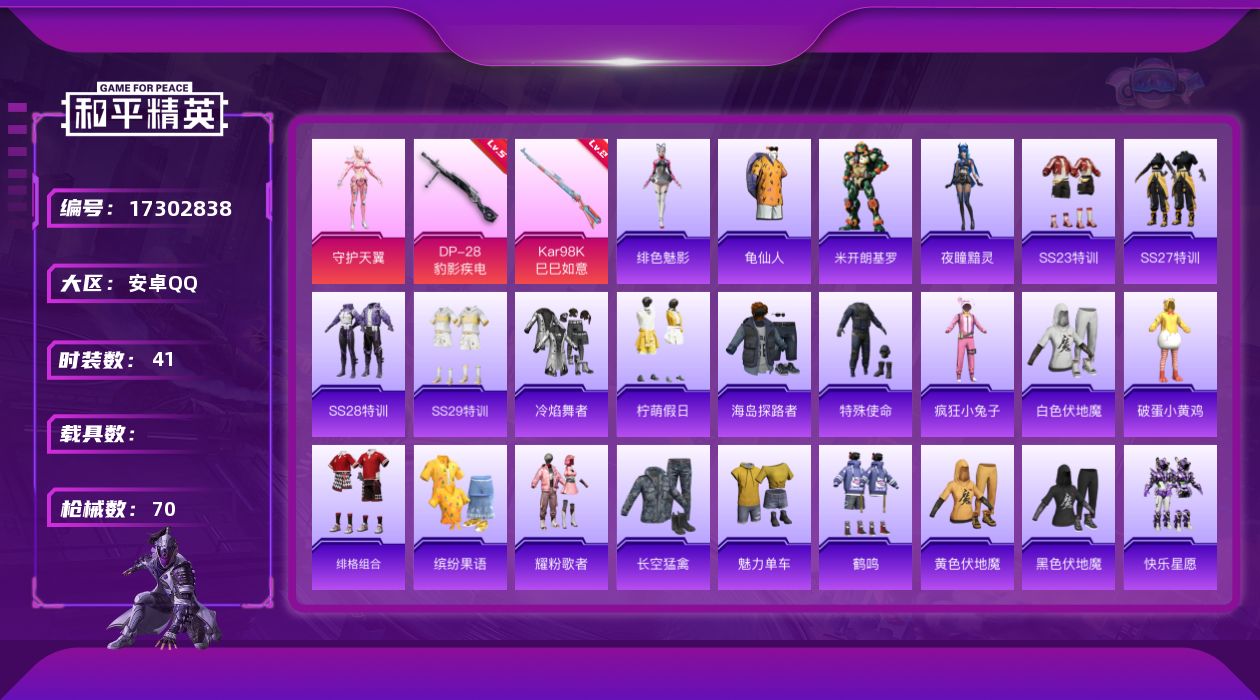 [17302838]【特价出售/店主推荐】安卓 手Q-1粉装-2特效枪-0载具-2粉色飞行器-18727热力值-1王牌印记-41套装-70枪皮 【热门品类】:套装-龟仙人 【粉色套装】:角色-守护天翼 【粉色枪皮等级】:Kar98K-巳巳如意(二级),DP-28-豹影疾电(五级) 【粉色枪皮】:Kar98K-巳巳如意,DP-28-豹影疾电 【粉色飞行器】:冠军兔兔飞行器 【粉色降落伞】:临安公主降落伞,脆鲨七海降落伞,异瞳寒姬降落伞,炫彩糖果降落伞 【稀有套装】:套装-龟仙人,套装-雪国风尚,角色-米开朗基罗,角色-夜瞳黯灵,角色-绯色魅影 【稀有枪皮】:AKM-龙的传人,M16A4-幻世战舞者,SCAR-L-夜灯,SCAR-L-红色方程式,M416-红色方程式,M416-蓝色火焰,AUG-耀粉歌者,QBZ-彩虹符号,M762-天降萌叽,G36C-星穹咏叹调,AC-VAL-天降萌叽,蜜獾-绯穹魔姬,UZI-啾咪啾咪,UZI-天降萌叽,UMP45-夜灯,汤姆逊-天降萌叽,Kar98K-红色方程式,SKS-炫彩节奏,Mini14-炫彩节奏,AMR-喜羊羊与灰太狼,S686-彩虹符号,S686-红色方程式,S1897-炫彩节奏,S12K-破晓战魂,S12K-夜灯,DP-28-彩虹符号,MG3-幻世战舞者,短管霰弹-星穹咏叹调,平底锅-无垠阁,破片手榴弹-巳巳如意 【其他套装】:套装-SS23特训,套装-SS27特训,套装-SS28特训,套装-SS29特训,套装-冷焰舞者,套装-柠萌假日,套装-海岛探路者,套装-特殊使命,套装-疯狂小兔子,套装-白色伏地魔,套装-破蛋小黄鸡,套装-绯格组合,套装-缤纷果语,套装-耀粉歌者,套装-长空猛禽,套装-魅力单车,套装-鹤鸣,套装-黄色伏地魔,套装-黑色伏地魔,套装-龟仙人,套装-快乐星愿 【稀有背包】:深海小丑鱼背包(2级) 【营地ID】:994609863