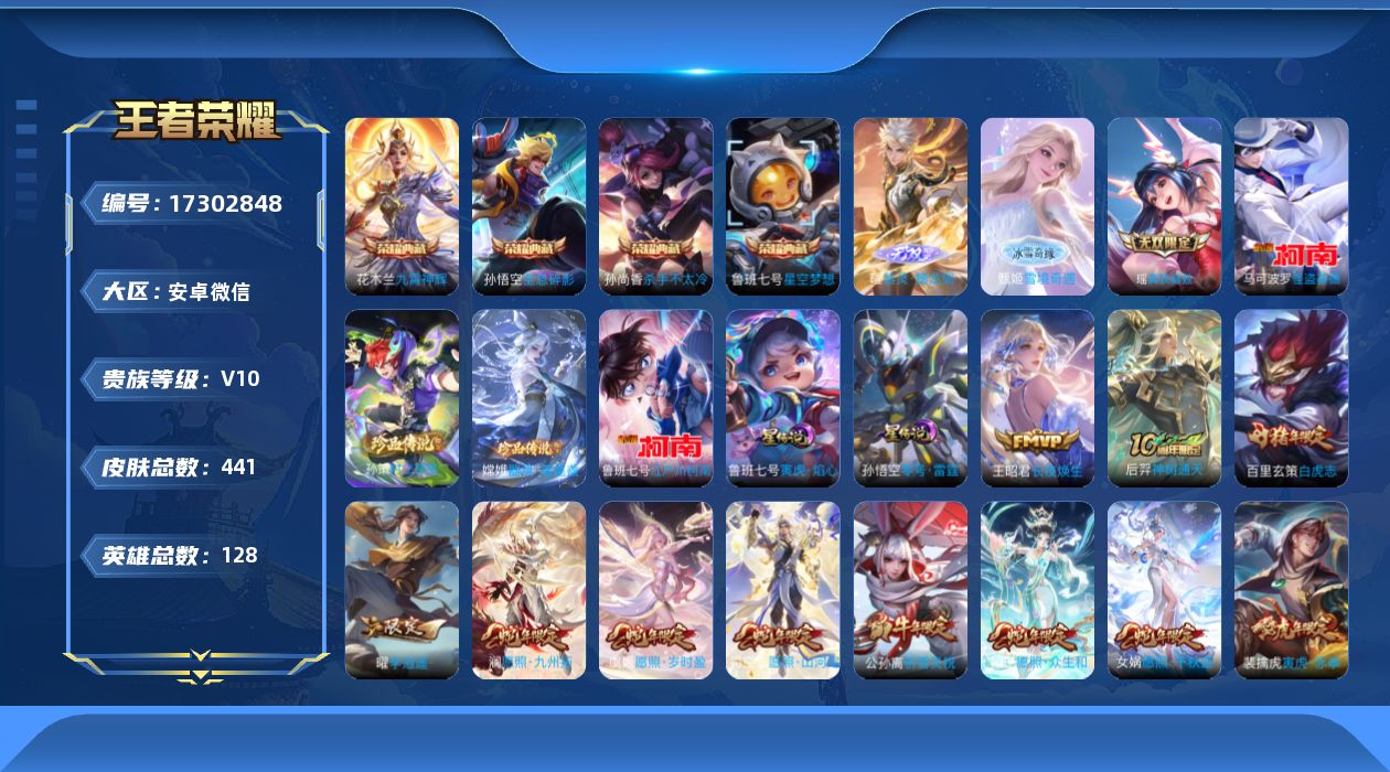 [17302848]安卓WX-V10-最强王者段位-128英雄-441皮肤-4典藏皮肤-3无双-4珍品传说-66传说-137史诗