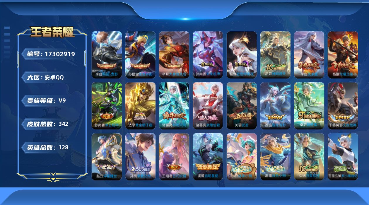 [17302919]【特价出售/店主推荐】安卓Q-V9-最强王者段位-128英雄-342皮肤-3典藏皮肤-1典藏英雄-2星传说-15传说-108史诗