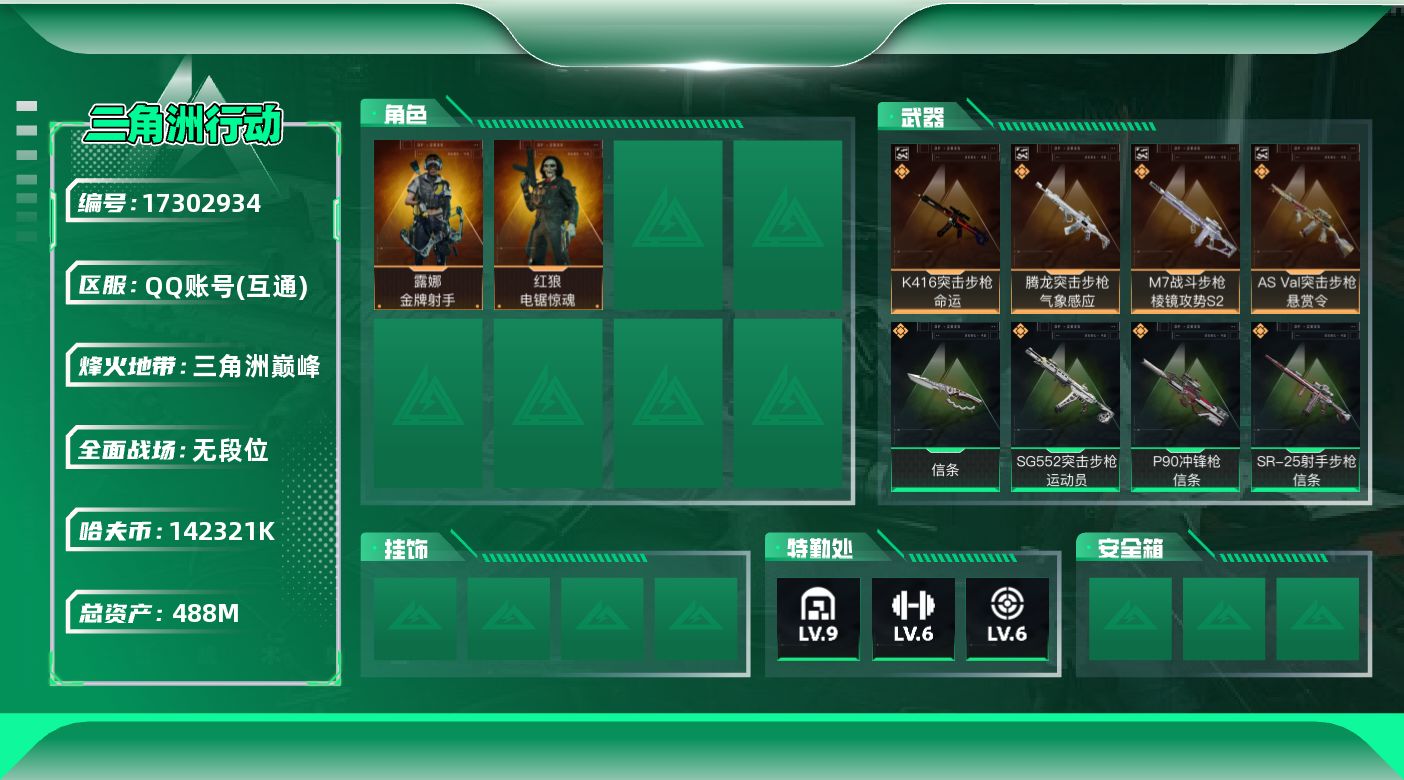 - [11680713]总资产:83.3M 5传说枪械 哈夫币:3.547K 可二次 可修改实名 烽火地带段位:无段位 全面战场段位:无段位 传说武器皮肤:M4A1突击步枪-阿米娅,AK-12突击步枪-特斯拉线圈,SR-3M紧凑突击步枪-特斯拉线圈,UZI冲锋枪-特斯拉线圈,勇士冲锋枪-能天使-午夜邮差 史诗武器皮肤:AUG突击步枪-蝮蛇,SV-98狙击步枪-林中猎手,AS Val突击步枪-典狱官,SV-98狙击步枪-囚徒