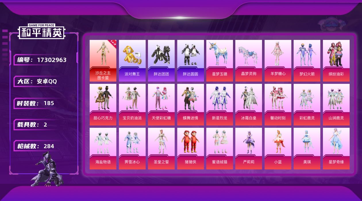 [17302963]安卓 手Q-无敌战神框-1神装-27粉装-19特效枪-2载具-12粉色飞行器-102485热力值-19王牌印记-185套装-284枪皮