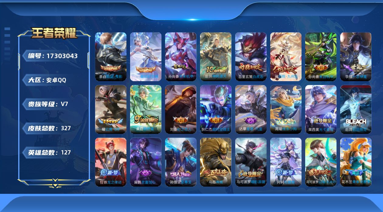 - [11884677]V8 1典藏 1无双 1珍品传说 22传说 124英雄 263皮肤 可修改实名 优质装备:鸣剑·曳影,器灵·螭龙剑,怪盗基德,云鹰飞将(小将军),炽阳神光,一念神魔,仲夏夜之梦(大飞蛾),地狱之眼,李逍遥,时之恋人-刘备(电焊工),淬星耀世,超时空战士-狄仁杰,无双飞将,山海·炽霜斩(李信年限),山海·苍雷引(电光曜子),澜逐花归海 传说皮:幻光神枪 珍宝阁皮:万物之道,蔷薇恋人,玩趣恶龙 限定皮:愿照·九州拓(澜年限),鸣野蒿,白虎志(电光耗子),武陵仙君(小桃花),异界灵契(白毛香),傲雪梅枪,神威(电光马子),山海·碧波行(瑶年限),遇见飞天,高山流水,齐天大圣,五谷丰年,青龙志(铠年限),梁祝,岱宗(典韦年限),李小龙,朱雀志(守约年限),默契交锋-兰陵王,默契交锋-花木兰,孙行者,大圣娶亲,山海·玄木吟(马可年限) 史诗皮:器灵·浮梦炉,化蝶舞,破空之剑,百相守梦-百里守约,百相守梦-黄忠,织梦人,紫霞仙子,电玩小子(小书包),白龙吟,特工魅影,千年之狐,永昼,江河有灵,鹤归松栖(赵怀真),百解令(蒙犽),高渐离燃音魔法,蒙恬荣光圣徽,冰冠公主,偶像歌手,白蛇,晚萤,电玩·爆裂旋风,末日机甲-吕布,猫狗日记-孙策,猫狗日记-大乔,时之恋人-孙尚香,乱世虎臣,节奏热浪,修罗,女仆咖啡,摇滚巨星,水果甜心,绅士熊喵,天才门将,星夜王子,心灵骇客,时之奇旅-安琪拉,功夫厨神,暗隐猎兽者,幽灵船长,鬼剑武藏,心灵战警,天秀·启明,舞动绿茵,地狱岩魂,纤云弄巧,拒霜思,缤纷独角兽,乘风破浪,逐浪之夏,水晶猎龙者,曙光守护者,箭羽风息,唤灵魅影,金属风暴,圣诞狂欢,圣诞恋歌,鹰眼统帅,赏金猎手,无心,未来纪元-赵云