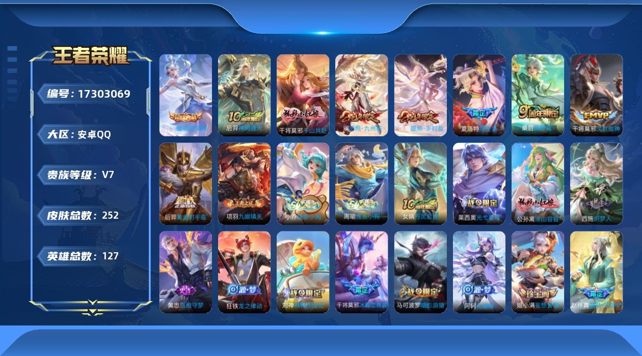 [17303069]【特价出售/店主推荐】安卓Q-V7-至尊星耀V段位-127英雄-252皮肤-1典藏皮肤-8传说-70史诗