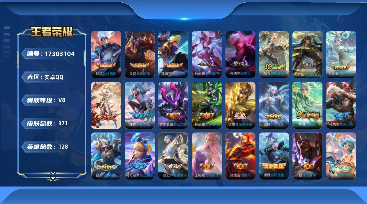- [11472190]V9 1典藏 2珍品传说 23传说 126英雄 340皮肤 典藏英雄武则天 可修改实名 荣耀水晶:弑枪猎影(韩信典藏) 珍品传说:江户川柯南,时之奇旅-孙策 传说皮:铠冥王哈迪斯,幻光神枪,地狱火,仲夏夜之梦(大飞蛾),海洋之心,地狱之眼,一念神魔,云鹰飞将(小将军),无双飞将,乞巧织情,时之恋人-刘备(电焊工),超时空战士-狄仁杰 珍宝阁皮:妄想食味 限定皮:愿照·九州拓(澜年限),愿照·岁时盈(虞姬年限),愿照·山河定(司空震年限),愿照·众生和(妲己年限),愿照·千秋盛(女娲年限),逐霄战戟,陌上桑,鸣野蒿,夏侯惇霜北刀,至尊宝,白虎志(电光耗子),凤求凰(白切鸡),魔法小厨娘,飞衡(韩信年限),至美·乘鲤谣,天狼狩猎者,逐梦之星,岱宗(典韦年限),天狼溯光者,李小龙,辉光之辰,猪悟能,大圣娶亲,天魔缭乱,青春决赛季,冰霜恋舞曲,神奇女侠 史诗皮:星界战将,茶境仙,器灵·浮梦炉,龙之律动,石田雨龙,百相守梦-百里守约,百相守梦-黄忠,戍鼓铭心,东方月初,蒙犽顽岩魄,埋骨钱,海诺心动手记,百相守梦-周瑜,化蝶舞,破空之剑,紫霞仙子,苍穹之光,黄金分割率,特工魅影,千年之狐,永昼,冰冠公主,青蛇,偶像歌手,晚萤,魅语,末日机甲-吕布,猫狗日记-孙策,猫狗日记-大乔,时之恋人-孙尚香,乱世虎臣,节奏热浪,修罗,女仆咖啡,摇滚巨星,水果甜心,绅士熊喵,天才门将,星夜王子,心灵骇客,功夫厨神,德古拉伯爵,暗隐猎兽者,幽灵船长,鬼剑武藏,暗渊魔法,心灵战警,乐园奇幻夜,天秀·启明,舞动绿茵,地狱岩魂,纤云弄巧,缤纷独角兽,乘风破浪,逐浪之夏,水晶猎龙者,曙光守护者,箭羽风息,金属风暴,圣诞狂欢,圣诞恋歌,鹰眼统帅,暗夜贵公子,魅力维加斯,赏金猎手,未来纪元-赵云