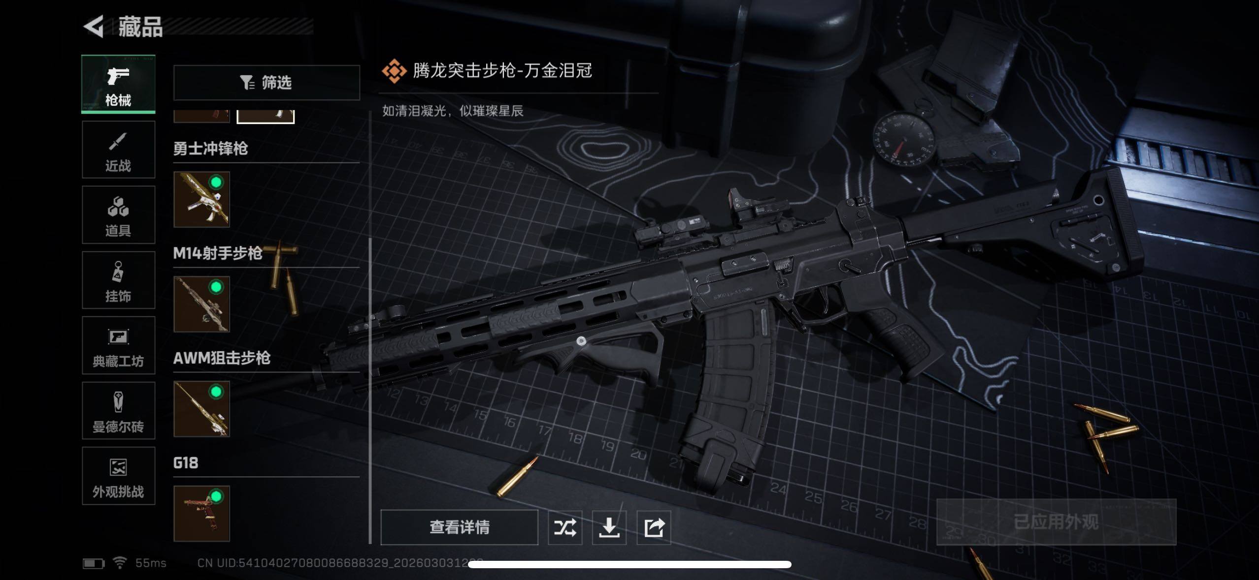 【传说外观】:QBZ95-1突击步枪-凌霄戍卫,腾龙突击步枪-马年祥瑞,腾龙突击步枪-万金泪冠,勇士冲锋枪-万金泪冠,M14射手步枪-蛮荒,AWM狙击步枪-万金泪冠,G18-马年祥瑞