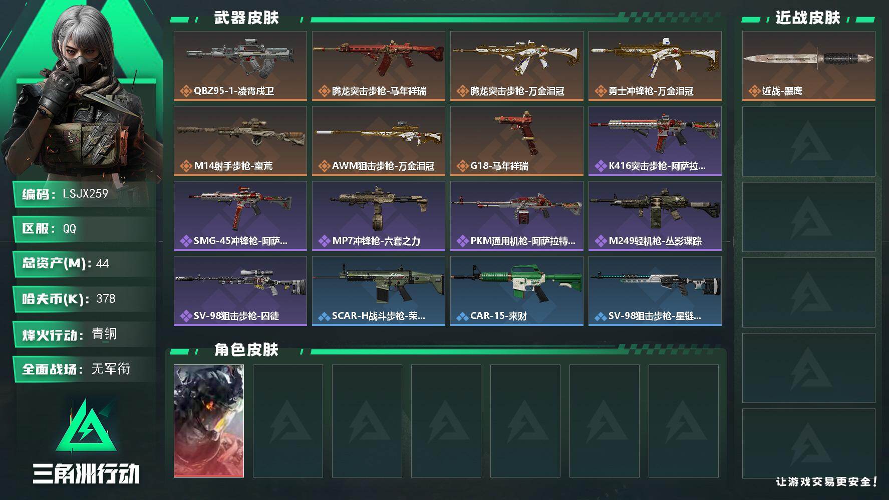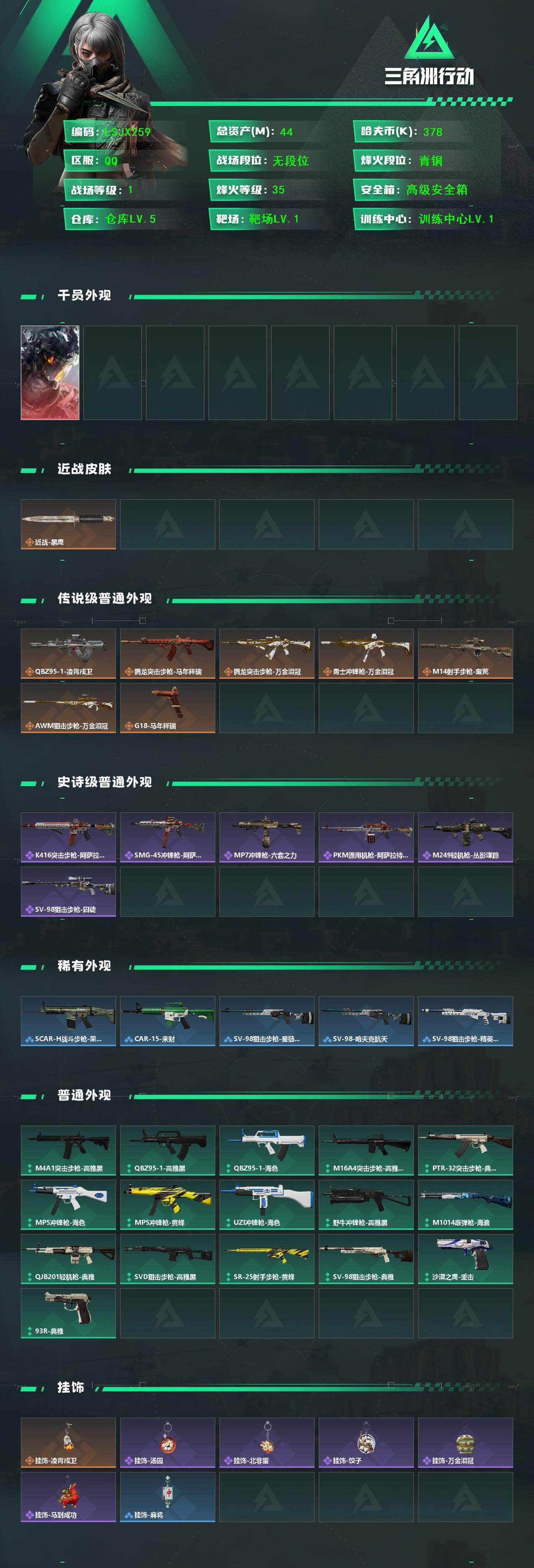 [17303346]【特价出售/店主推荐】44m总资产-378k哈伏币-35烽火等级-青铜-1战场等级-无军衔 【干员外观】:威龙-凌霄戍卫 【近战皮肤】:近战-黑鹰 【传说外观】:QBZ95-1突击步枪-凌霄戍卫,腾龙突击步枪-马年祥瑞,腾龙突击步枪-万金泪冠,勇士冲锋枪-万金泪冠,M14射手步枪-蛮荒,AWM狙击步枪-万金泪冠,G18-马年祥瑞 【史诗外观】:K416突击步枪-阿萨拉特攻,SMG-45冲锋枪-阿萨拉特攻,MP7冲锋枪-六套之力,PKM通用机枪-阿萨拉特攻,M249轻机枪-丛影谍踪,SV-98狙击步枪-囚徒 【稀有外观】:SCAR-H战斗步枪-荣耀列队,CAR-15突击步枪-来财,SV-98狙击步枪-星链科技,SV-98狙击步枪-哈夫克航天,SV-98狙击步枪-精英联盟 【普通外观】:M4A1突击步枪-高雅黑,QBZ95-1突击步枪-高雅黑,QBZ95-1突击步枪-海色,M16A4突击步枪-高雅黑,PTR-32突击步枪-典雅,MP5冲锋枪-海色,MP5冲锋枪-黄蜂,UZI冲锋枪-海色,野牛冲锋枪-高雅黑,M1014霰弹枪-海浪,QJB201轻机枪-典雅,SVD狙击步枪-高雅黑,SR-25射手步枪-黄蜂,SV-98狙击步枪-典雅,沙漠之鹰-重击,93R-典雅 【挂饰】:挂饰-凌霄戍卫,挂饰-汤圆,挂饰-北非蛋,挂饰-饺子,挂饰-万金泪冠,挂饰-马到成功,挂饰-麻将*3