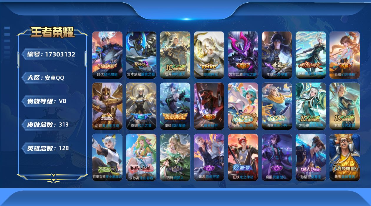 [17303132]【特价出售/店主推荐】安卓Q-V8-最强王者段位-128英雄-313皮肤-1典藏皮肤-1星传说-10传说-90史诗