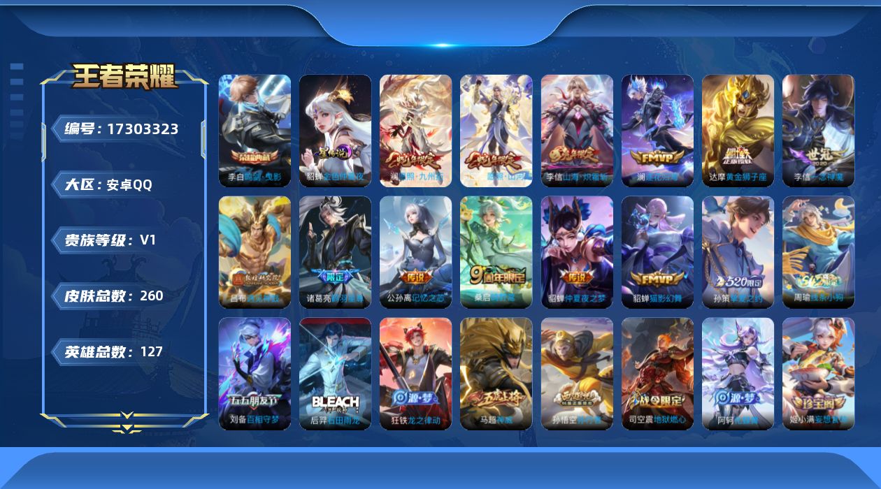 [17303323]【特价出售/店主推荐】安卓Q-V0-永恒钻石V段位-127英雄-260皮肤-1典藏皮肤-1星传说-13传说-82史诗