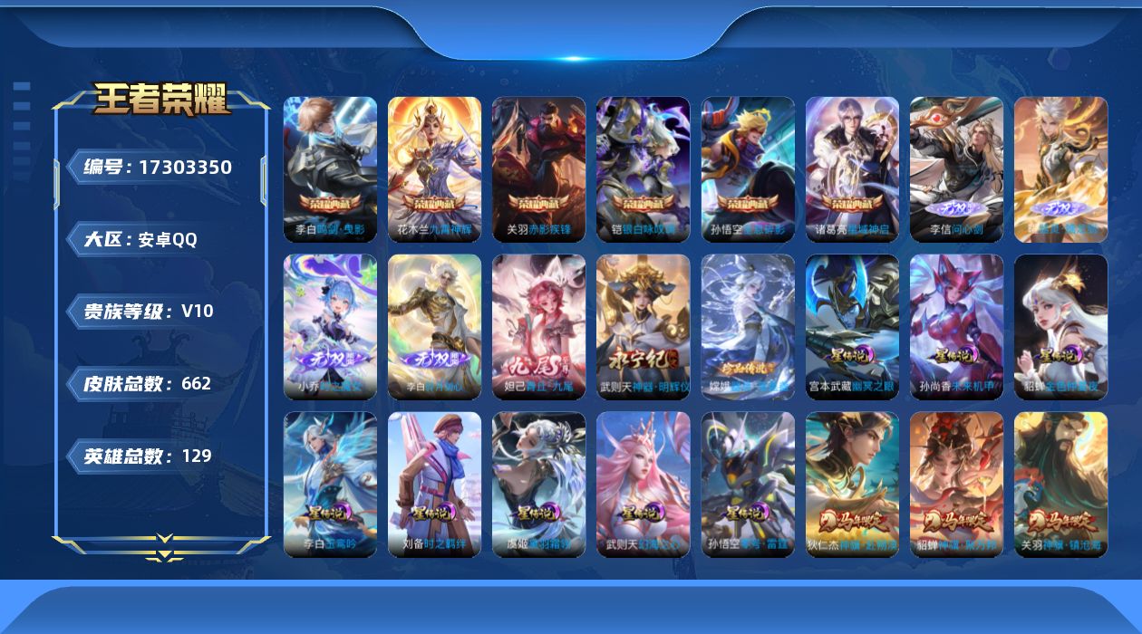 [17303350]【特价出售/店主推荐】6市标、打野47段、对抗路31段,安卓Q-V10-最强王者段位-129英雄-662皮肤-6典藏皮肤-1典藏英雄-6无双-1珍品传说-8星传说-114传说-235史诗 【英雄全皮】:廉颇全皮,赵云全皮,妲己全皮,嬴政全皮,刘禅全皮,阿轲全皮,扁鹊全皮,白起全皮,典韦全皮,李白全皮,露娜全皮,姜子牙全皮,刘邦全皮,孙权全皮,花木兰全皮,娜可露露全皮,橘右京全皮,杨玉环全皮,苍全皮,女娲全皮,鬼谷子全皮,黄忠全皮,梦奇全皮,沈梦溪全皮,狂铁全皮,李信全皮,盾山全皮,猪八戒全皮,亚连全皮,嫦娥全皮,马超全皮,敖隐全皮,曜全皮,鲁班大师全皮,蒙恬全皮,澜全皮,镜全皮,夏洛特全皮,司空震全皮,金蝉全皮,戈娅全皮,空空儿全皮,影全皮,海诺全皮,少司缘全皮 【荣耀典藏】:武则天英雄,孙悟空全息碎影,李白鸣剑曳影,诸葛亮星域神启,花木兰九霄神辉,关羽赤影疾锋,铠银白咏叹调 【无双皮肤】:李信问心剑,曜器灵螭龙剑,小乔时之魔女,李白碎月剑心,妲己青丘九尾,武则天神器明辉仪 【珍品传说】:嫦娥器灵落星盏 【传说皮肤】:韩信踏浪归,云缨神骥越千峰,关羽神骥镇沧海,朵莉亚神骥鸣幻洲,狄仁杰神骥赴朔漠,貂蝉神骥聚万邦,马超神骥逐星野,花木兰异界灵契,王昭君长夜焕生,杨戬纵目迁山,后羿神树通天,曹操万灵伏威,公孙离云诺千山,杨玉环星之鸣奏,后羿千劫归真,司空震愿照山河定,女娲愿照千秋盛,妲己愿照众生和,澜愿照九州拓,蔡文姬愿照福禄聚,虞姬愿照岁时盈,云缨幻光神枪,裴擒虎祥瑞亨通,嬴政玄雷天君,桑启鸣野蒿,庄周牧神诗旅,夏侯惇霜北刀,铠冥王哈迪斯,海月金乌负日,亚连落雪白狼,吕布曦玄引,貂蝉曦玄引,典韦战鼓燎原,孙尚香乘龙问璇玑,孙策乘龙淬吴钩,赵云乘龙铭钟鼎,马超琥珀纪元,澜逐花归海,艾琳觅芳踪,露娜霜月吟,兰陵王影龙天霄,吕布遇见神鼓,宫本武藏惊梅引,马可波罗妄想实况,澜电玩雷克斯,亚瑟追逃游戏,安琪拉追逃游戏,张飞百相守梦,公孙离记忆之芯,夏洛特浮生妄,干将莫邪画中仙,花木兰燃星之曲,虞姬无限倾心,项羽无限倾心,伽罗炽翼辉光,孙悟空齐天大圣,小乔山海琳琅生,曜山海苍雷引,李信山海炽霜斩,吕布怒海麟威,李白诗剑行,狄仁杰神器狴犴令,不知火舞绯月行,王昭君星穹之声,百里守约碎云,橘右京枫霜尽,娜可露露前尘镜,孙尚香音你闪耀,马可波罗深海之息,马超无双飞将,露娜启示之音,蔡