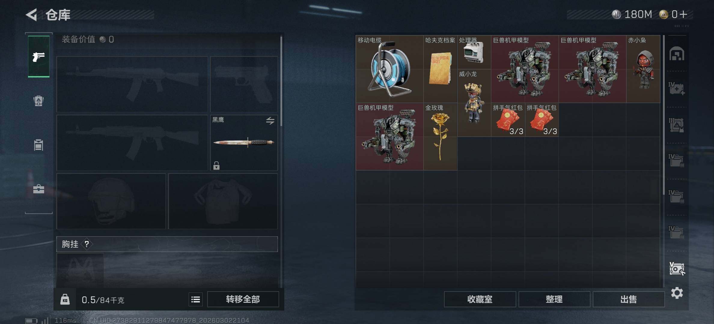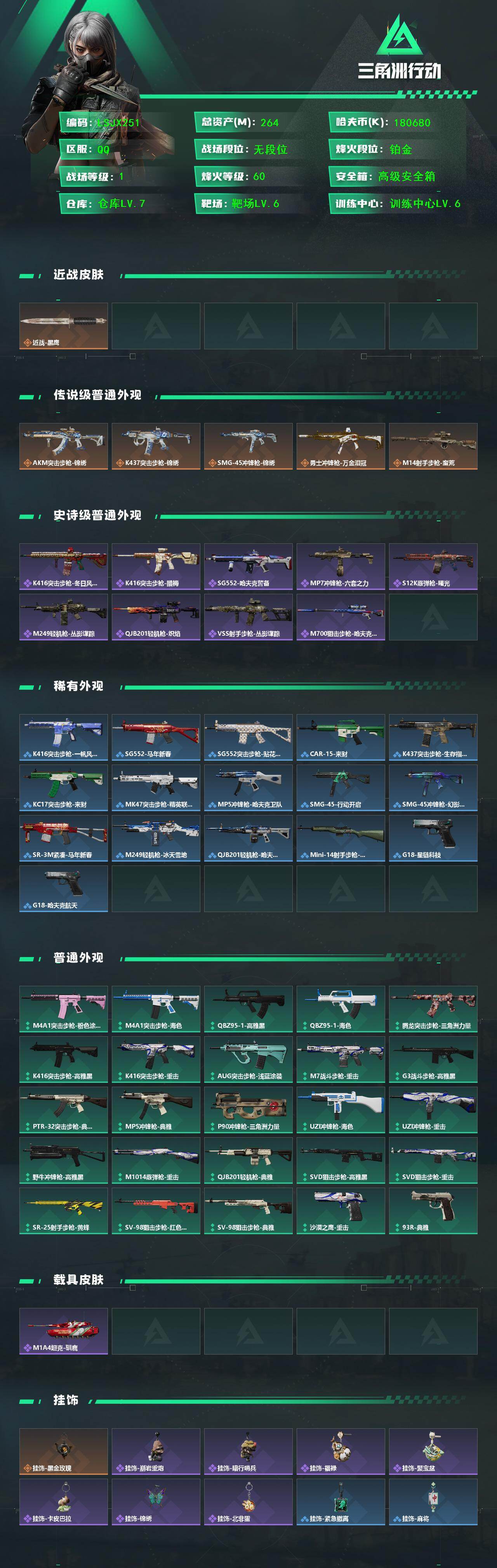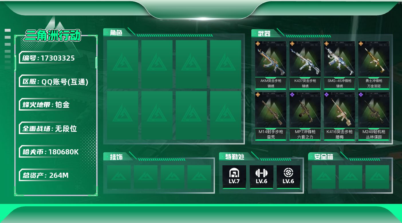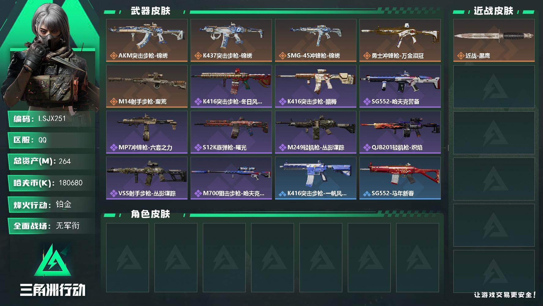[17303325]【特价出售/店主推荐】264m总资产-180680k哈伏币-60烽火等级-铂金-1战场等级-无军衔 【近战皮肤】:近战-黑鹰 【传说外观】:AKM突击步枪-锦绣,K437突击步枪-锦绣,SMG-45冲锋枪-锦绣,勇士冲锋枪-万金泪冠,M14射手步枪-蛮荒 【史诗外观】:K416突击步枪-冬日风情,K416突击步枪-腊梅,SG552突击步枪-哈夫克警备,MP7冲锋枪-六套之力,S12K霰弹枪-曙光,M249轻机枪-丛影谍踪,QJB201轻机枪-炽焰,VSS射手步枪-丛影谍踪,M700狙击步枪-哈夫克警备 【稀有外观】:K416突击步枪-一帆风顺,SG552突击步枪-马年新春,SG552突击步枪-贴花艺术,CAR-15突击步枪-来财,K437突击步枪-生存指令,KC17突击步枪-来财,MK47突击步枪-精英联盟,MP5冲锋枪-哈夫克卫队,SMG-45冲锋枪-行动开启,SMG-45冲锋枪-幻影结构,SR-3M紧凑突击步枪-马年新春,M249轻机枪-冰天雪地,QJB201轻机枪-哈夫克卫队,Mini-14射手步枪-荣耀列队,G18-星链科技,G18-哈夫克航天 【普通外观】:M4A1突击步枪-粉色涂装,M4A1突击步枪-海色,QBZ95-1突击步枪-高雅黑,QBZ95-1突击步枪-海色,腾龙突击步枪-三角洲力量,K416突击步枪-高雅黑,K416突击步枪-重击,AUG突击步枪-浅蓝涂装,M7战斗步枪-重击,G3战斗步枪-高雅黑,PTR-32突击步枪-典雅,MP5冲锋枪-典雅,P90冲锋枪-三角洲力量,UZI冲锋枪-海色,UZI冲锋枪-重击,野牛冲锋枪-高雅黑,M1014霰弹枪-重击,QJB201轻机枪-典雅,SVD狙击步枪-高雅黑,SVD狙击步枪-重击,SR-25射手步枪-黄蜂,SV-98狙击步枪-红色涂装,SV-98狙击步枪-典雅,沙漠之鹰-重击,93R-典雅 【载具外观】:M1A4坦克-驯鹿 【挂饰】:挂饰-蚀金玫瑰,挂饰-崩岩重炮,挂饰-暗行哨兵,挂饰-福禄*3,挂饰-聚宝盆*2,挂饰-卡皮巴拉,挂饰-锦绣,挂饰-北非蛋,挂饰-紧急撤离*8,挂饰-麻将*15