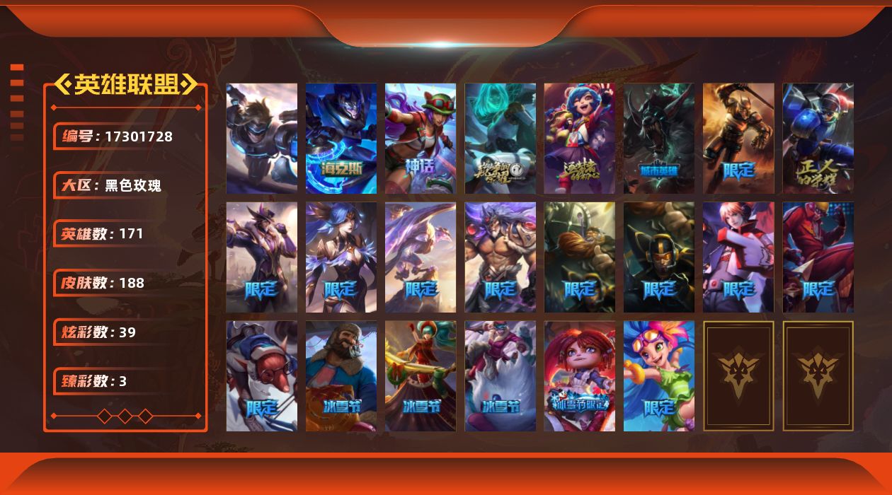 [17301728]可二次【特价出售/店主推荐】青铜段位-171英雄-188皮肤-39炫彩-1终极-4神话-20限定-10传说-49史诗