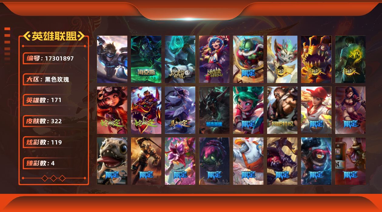 [17301897]【店主推荐捡漏号】未定级段位-171英雄-322皮肤-119炫彩-1终极-3神话-56限定-29传说-75史诗
