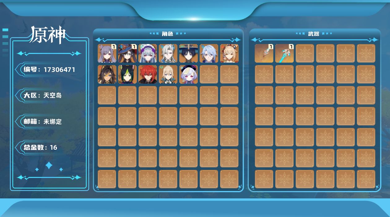 - [14744607]57级/22黄/女主/16个五星角色/2个五星武器 1命阿蕾奇诺,0命芙宁娜,0命迪希雅,0命流浪者,0命纳西妲,0命妮露,1命赛诺,0命提纳里,0命申鹤,0命雷电将军,0命钟离,0命达达利亚,0命刻晴,0命七七,1命莫娜,1命迪卢克,精1天空之翼,精1风鹰剑
