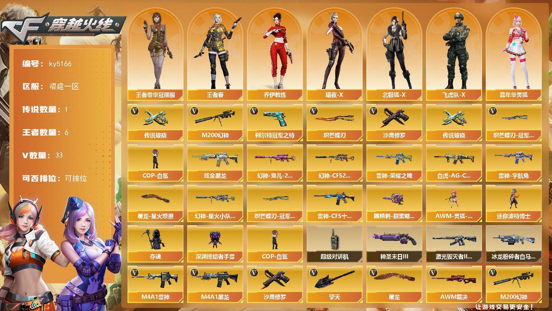 [17308322]福建一区-33V-6王者-1炫金 【传说武器】:传说破晓 【热门武器】:传说破晓,M200-幻神,柯尔特-冠军之特,COP-白鲨,沙鹰-修罗,炽芒蝶刃,炽芒蝶刃-冠军炽芒皮肤 【王者炫金武器】:炫金黑龙 【皮肤】:幻神-宠儿-2021MVP,幻神-CFS2022,幻神-星火小队签名臻藏版 皮肤,白虎-AG-CFPLS20冠军,雷神-荣耀之魄,雷神-宇航兔皮肤,雷神-CFS十周年纪念版 皮肤,屠龙-星火燎原,麒麟刺-甜蜜糖果 皮肤,炽芒蝶刃-冠军炽芒皮肤 【角色】:王者零-华冠丽服,王者春,乔伊教练,暗夜-X,北极狐-X,飞虎队-X,嘉年华灵狐,灵狐者-X,曼陀罗-X,潘多拉-X,斯沃特-X,游珑儿 【人偶武器】:COP-白鲨,AWM-灵狐-15周年嘉年华,迷你波特博士,夺魂,深渊终结者手雷 【暴走生化】:超级对讲机 【挑战大师】:冰龙粉碎者-白马银枪,激光毁灭者III-白马银枪,神圣爆裂者-末日III 【英雄级武器】:M4A1-黑龙,M4A1-雷神,无影-神兵利器,QBZ03-云龙,黑武士-锦绣游龙,烈火-动感闪耀,AWM-裁决,M200-幻神,沙鹰-修罗,柯尔特-冠军之特,天神-动感闪耀,屠龙,擎天,炽芒蝶刃,屠龙-动感闪耀,斩神刀-雷暴,高爆手雷-雷霆,高爆手雷-雷暴,高爆手雷-幻灵*2,手雷-动感闪耀,高爆手雷-云龙,闪光弹-雷霆,闪光弹-雷暴,闪光弹-幻灵*2,闪光弹-雷霆王者-觉醒版*2,烟雾弹-雷霆,烟雾弹-雷暴,烟雾弹-幻灵*2,烟雾弹-云龙,烟雾弹-雷霆王者-觉醒版,M4A1-赤狱骑士 【道具】:AG战队炫彩背包,CFS限定背包,EP战队炫彩背包,全能枪王背包,女皇终结者-魔龙之吻,救世主-黑桃战神,绿色巨人,灵魂忍者,变异宝贝,迷雾幽灵,夺命之镰,防化服*2,金色流光-枪王排位*2,星辰流光-枪王排位,枪王排位28赛季金色流光,枪王排位29赛季金色流光,斯沃特表情,动感闪耀表情,EP战队名片,EP战队喷图,防弹头盔*2,防弹衣*2,C4工具钳*2,手雷包*2 【特殊枪械】: