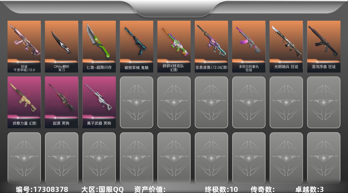 [17308378]【英雄】:幻棱,炼狱,维斯,暮蝶,钛狐,壹决,铁臂,捷风,雷兹,幽影,不死鸟,贤者,猎枭,蝰蛇,零,芮娜,奇乐,尚勃勒,霓虹,斯凯,夜露,星礈,K/O,海神,盖可,黑梦,钢锁 【近战武器】:近战武器-ORA x 颗秒 军刀,近战武器-紫金爪刀,近战武器-超限闪存 匕首 【狂徒】:狂徒-光明哨兵,狂徒-混沌序曲,狂徒-多弥尔的复仇,狂徒-千灵华绽//2.0 【幻影】:幻影-砰砰X特攻队,幻影-全息波普//2.0,幻影-侦察力量,幻影-超限闪存 【戍卫】:戍卫-浮光跃金 【獠犬】:獠犬-模拟赫兹 【冥驹】:冥驹-离子武器,冥驹-起源,冥驹-模拟赫兹 【莽侠】:莽侠-超限闪存 【战神】:战神-浮光跃金 【雄鹿】:雄鹿-模拟赫兹 【骇灵】:骇灵-浮光跃金 【蜂刺】:蜂刺-超限闪存 【标配】:标配-超能偶像,标配-浮光跃金 【正义】:正义-超限闪存,正义-纳米打击 【鬼魅】:鬼魅-破败军械,鬼魅-灵魂消声者,鬼魅-模拟赫兹 【卡面】:进入射程 卡面,精灵大战 卡面,欢迎来到底城 卡面,南瓜盛典 卡面,唱片的故事 卡面,钢弓与箭弦 卡面,排除故障 卡面,战术桌游 卡面,悠享食光 卡面,修车达人 卡面,模拟赫兹 卡面,浮光跃金 卡面,超限闪存 卡面,维斯工牌 卡面,正义的化身 卡面,终章:生意人麦宝 卡面,铁之华 卡面,时间到 卡面,最高舞台 卡面,声感陷阱设计图 卡面,Clutch 卡面,梦幻奶茶 卡面,无畏契约:蝰蛇 卡面,无畏契约GO!第一卷:芮娜 卡面,无畏契约GO!第一卷:零 卡面,《双城之战》金克丝 卡面,暗枪 卡面,代号红色 卡面,冰淇淋店 卡面,新兵报到 卡面,V契约 卡面,无畏契约 卡面 【喷漆】:嗨宝南瓜灯 喷漆,控场勿近 喷漆,皮蛋呼呼 喷漆,像素星礈 喷漆,图谋不轨的零 喷漆,小丑猫 喷漆,模拟赫兹 喷漆,高丽风情小熊 喷漆,蹲到一个 喷漆,全力集中 喷漆,超限闪存 喷漆,RUA一下 喷漆,熊抱 喷漆,高丽风情小虎 喷漆,记在小本本 喷漆,防弹企鹅 喷漆,高丽风情小蛙 喷漆,超级粉丝 喷漆,捷风差距 喷漆,惊声尖叫 喷漆,拼一枪 喷漆,致命毒素 喷漆,喜欢哪种毒? 喷漆,买装还是存钱 喷漆,胜利属于无畏契约 喷漆,GLHF 喷漆,无畏契约 喷漆 【挂饰】:V25第六幕:超凡 挂饰,终章:猫猫木乃伊 挂饰,悠闲鸡块 挂饰,伞绳 挂饰,第九季//第三幕 纪念