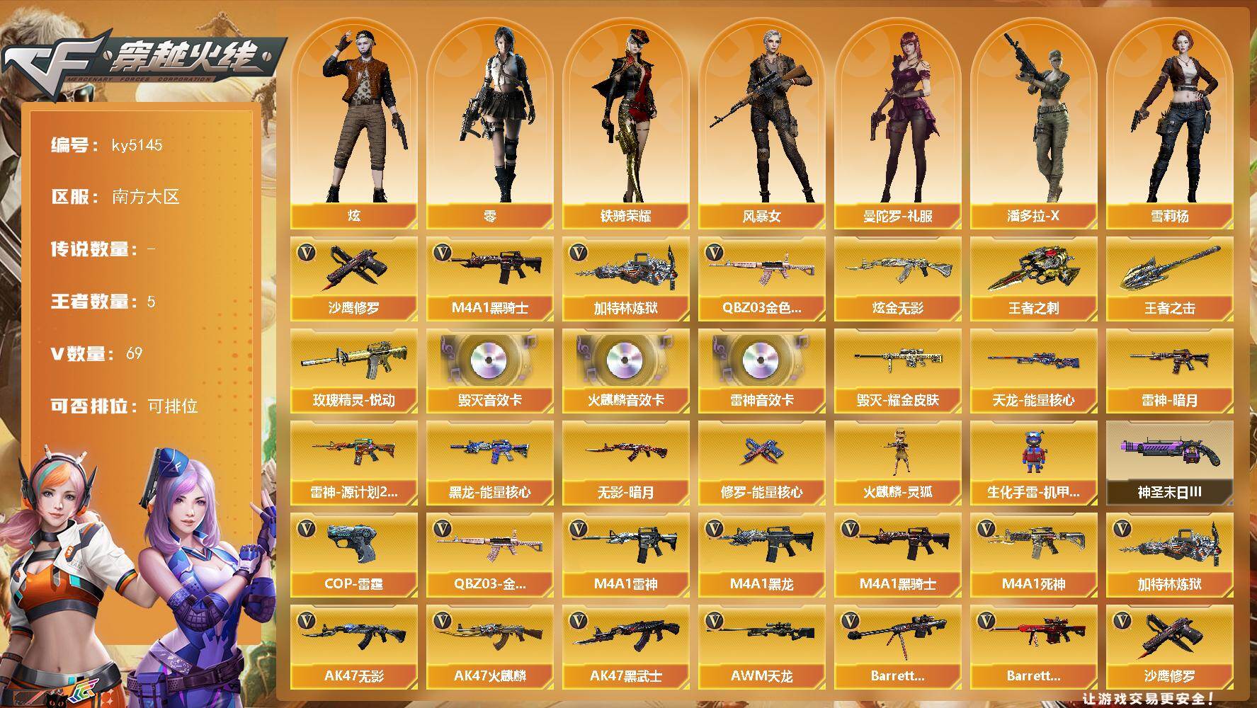 [17311010]南方大区-69V-5王者-1炫金 【热门武器】:QBZ03-金色蔷薇,M4A1-黑骑士,加特林-炼狱,沙鹰-修罗*6 【王者炫金武器】:玫瑰精灵-悦动,王者之刺,王者之击,炫金无影 【音效卡】:AK47-火麒麟音效卡,M4A1-雷神音效卡,Barrett-毁灭音效卡 【皮肤】:雷神-暗月,雷神-源计划2.0专属 皮肤,毁灭耀金皮肤,黑龙-能量核心,无影-暗月,天龙-能量核心,修罗-能量核心 【角色】:零,炫,风暴女,曼陀罗-礼服,潘多拉-X,铁骑荣耀,雪莉杨 【人偶武器】:火麒麟-灵狐,生化手雷-机甲核心 【挑战大师】:神圣爆裂者-末日III 【英雄级武器】:M4A1-千变,AK47-火麒麟,M4A1-黑龙,M4A1-雷神*2,M4A1-黑骑士,AK47-无影,M4A1-死神,AK47-黑武士,M4A1-雷霆*3,黑武士-锦绣游龙,QBZ03-金色蔷薇,王者之心-觉醒版,王者之武-觉醒版,AWM-天龙,Barrett-毁灭*2,Barrett-极光,AWM-裁决,加特林-炼狱,沙鹰-修罗*6,沙鹰-天神,COP-雷霆*2,COP 357-云龙,屠龙*3,龙啸*3,擎天,麒麟刺*2,高爆手雷-雷霆*8,闪光弹-雷霆*8,烟雾弹-雷霆*8,烟雾弹-云龙 【道具】:CFS限定背包,战舰背包,炫彩背包,哔哩哔哩名片,夺命之镰,防化服,金色流光-枪王排位,星辰流光-枪王排位,枪王排位28赛季金色流光,枪王排位29赛季金色流光,电玩兔兔表情,EP战队名片,EP战队喷图,防弹头盔*6,防弹衣*6,C4工具钳*4,手雷包*6 【特殊枪械】:1黑骑士,1炼狱