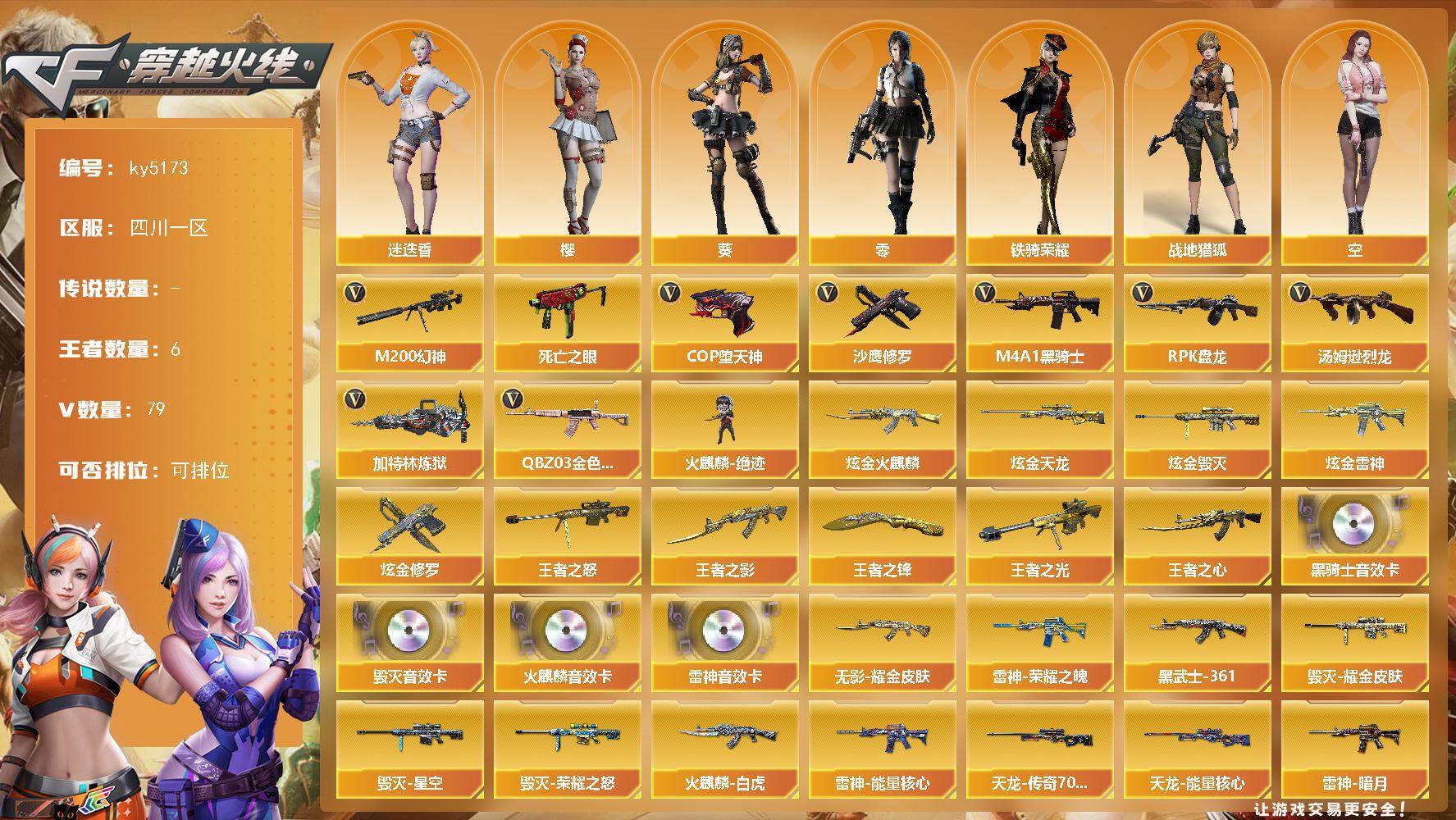 [17311494]四川一区-79V-6王者-9炫金 【热门武器】:QBZ03-金色蔷薇*3,M200-幻神,死亡之眼,M4A1-黑骑士,汤姆逊-烈龙*2,RPK-盘龙*5,加特林-炼狱,火麒麟-绝迹,COP-堕天神*2,沙鹰-修罗 【王者炫金武器】:王者之影,王者之心,王者之光,王者之怒,王者之锋,炫金火麒麟,炫金雷神*3,炫金毁灭*2,炫金天龙*2,炫金修罗 【音效卡】:AK47-火麒麟音效卡,M4A1-雷神音效卡,M4A1-黑骑士音效卡,Barrett-毁灭音效卡 【皮肤】:雷神-暗月,雷神-能量核心*2,雷神-荣耀之魄,火麒麟-雷神,火麒麟-白虎,毁灭-荣耀之怒,毁灭耀金皮肤,毁灭-星空,黑龙-能量核心,无影耀金皮肤,AK47-黑武士-361,战神-粉色甜心皮肤*3,战神-紫绶金章皮肤*3,战神-流金岁月皮肤,天龙-能量核心,AWM-天龙-传奇70KG 【角色】:零,葵,樱,迷迭香,战地猎狐,空,风暴女,麻雀,潜龙队-X,铁骑荣耀,影武者-X 【人偶武器】:火麒麟-绝迹,巴雷特-零-水下丽影*2,生化手雷-机甲核心,闪光弹-小乔,Barrett-夜玫瑰 【暴走生化】:死亡之眼 【英雄级武器】:M4A1-千变,AK47-火麒麟,M4A1-黑龙,M4A1-雷神*4,M4A1-黑骑士,AK47-无影,AK47-黑武士,AN94-超新星,AK47-黑鲨*2,M4A1-堕天神,QBZ03-金色蔷薇*3,王者之魄-觉醒版,AK-47-猩红传说*3,AK47-B-战神,AWM-天龙,Barrett-毁灭*2,AWM-裁决*2,M200-幻神,Barrett-金色蔷薇,RPK-盘龙*5,加特林-炼狱,汤姆逊-烈龙*2,沙鹰-修罗,COP-堕天神*2,屠龙*3,麒麟刺-堕天神*2,擎天*3,龙啸-堕天神*2,高爆手雷-雷霆,高爆手雷-堕天神*6,闪光弹-雷霆,闪光弹-堕天神*6,烟雾弹-雷霆,烟雾弹-堕天神*6,M4A1-赤狱骑士 【道具】:战舰背包,炫彩背包,超级背包,女皇终结者-魔龙之吻,救世主-黑桃战神,绿色巨人,灵魂忍者,迷雾幽灵,夺命之镰,防化服*2,金色流光-枪王排位,星辰流光-枪王排位,防弹头盔*3,防弹衣*3,C4工具钳*2,手雷包*2 【特殊枪械】:1黑骑士,2烈龙,5盘龙,1炼狱