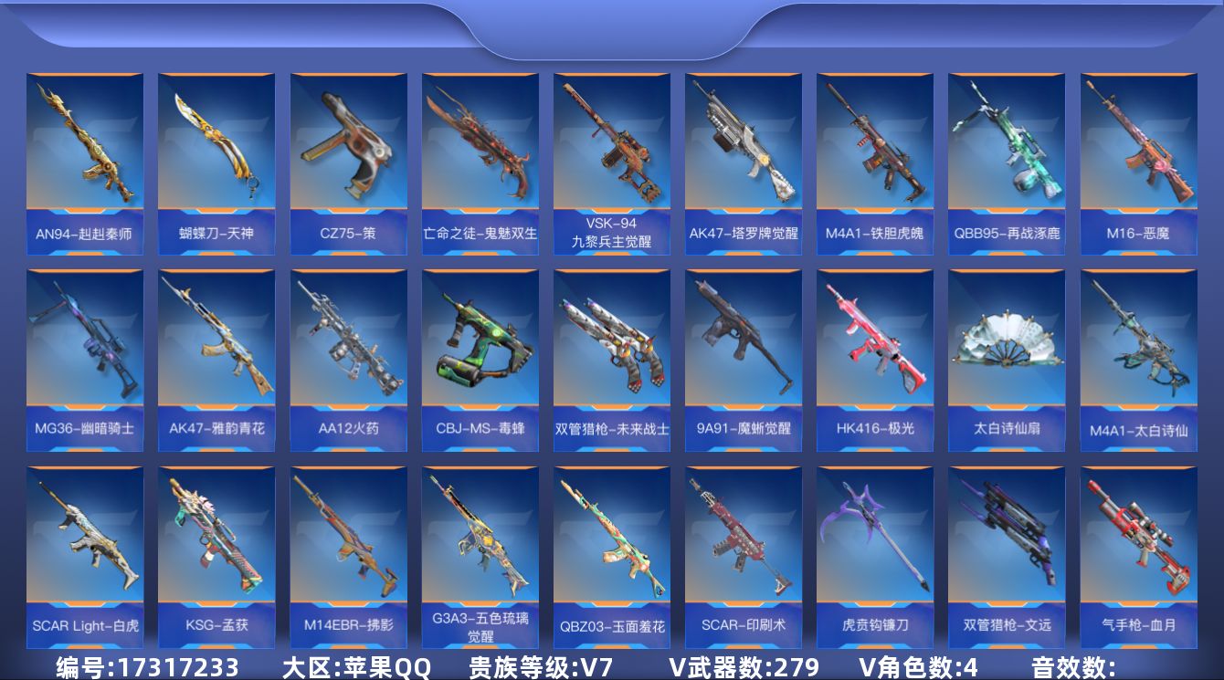 [17317233]大师-5英雄角色数-274英雄武器数 【王者系列】:王者之影,王者之迹,王者之蝶,王者之狱,王者之烈*3,王者之霆,王者之业,巴雷特-雷霆王者,M12S-雷霆王者 【热门武器】:KSG-孟获,CZS2-仲康,COP 357-安琪拉,AN94-盖,81式-光明之神,MK47-仁德,AK47-孟德,M4A1-仲达,AK47-奉先,M4A1-星象,M200-幻神,COP 357-雷霆,COP 357-星象 【角色】:葵,炽天使-X,祝融夫人,零-新生 【英雄武器】:AK47-无影*2,AK47-火麒麟*3,AK47-麒麟,AK47-孟德,AK47-幸运日觉醒,AK47-猩红传说*2,AK47-沙漠郡主-二觉,AK47-燎天净火,AK47-雷麒麟,AK47-奉先,AK47-血武士,AK47-华夏传说,AK47-死神,AK47-黑鲨,AK47-木兰,AK47-雅韵青花,AK47-塔罗牌觉醒,AK47-谜城烟火,M4A1-雷神*2,M4A1-黑骑士*2,M4A1-死神,M4A1-星象,M4A1-仲达,M4A1-冰锋觉醒,M4A1-堕天神,M4A1-心动次元觉醒,M4A1-运输船*2,M4A1-猎神,M4A1-千变,M4A1-太白诗仙,M4A1-铁胆虎魄,SCAR Light-白虎,SCAR-探星者,SCAR-印刷术,SCAR-心动PICK,剑齿虎,AN94-赳赳秦师,AN94-盖,AUG-机械纪元,9A91-魔蜥觉醒,M14EBR-天神,M14EBR-拂影*2,M14EBR-玄武,M16-恶魔*2,AK12-天启,QBZ03-金色蔷薇*2,QBZ03-死神,QBZ03-玉面羞花,HK416-极光,HK417-炎龙铠甲,81式-光明之神,QBZ19-天使,MK47-云舞,MK47-仁德,G3A3-五色琉璃觉醒,G3A3-衍神兵,QBZ97-岚舞,QBZ97-浩瀚征途,QBZ191-封神榜,AWM-裁决,AWM-天使,AWM-指南针,AWM-大湾溢彩,巴雷特-毁灭*3,巴雷特-极光*4,巴雷特-冬灭觉醒,巴雷特-雷霆王者,巴雷特-朱雀,暗杀神,M200-幻神,M200-心动次元觉醒,09式狙-天神*2,98K-黑骑士,98K-星神,VSK-94-九黎兵主觉醒,VSK-94-金蚀,加特林-堡垒*2,加特林-炼狱,加特林-蟒蛇,刘易斯-天使,MG36-幽暗骑士,QBB95-极光,QB