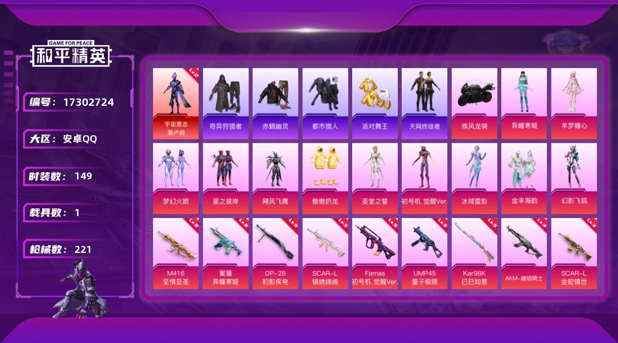 [17302724]【特价出售/店主推荐】安卓 手Q-1神装-11粉装-13特效枪-1载具-10粉色飞行器-7·6w热力值-9王牌印记-149套装-221枪皮
