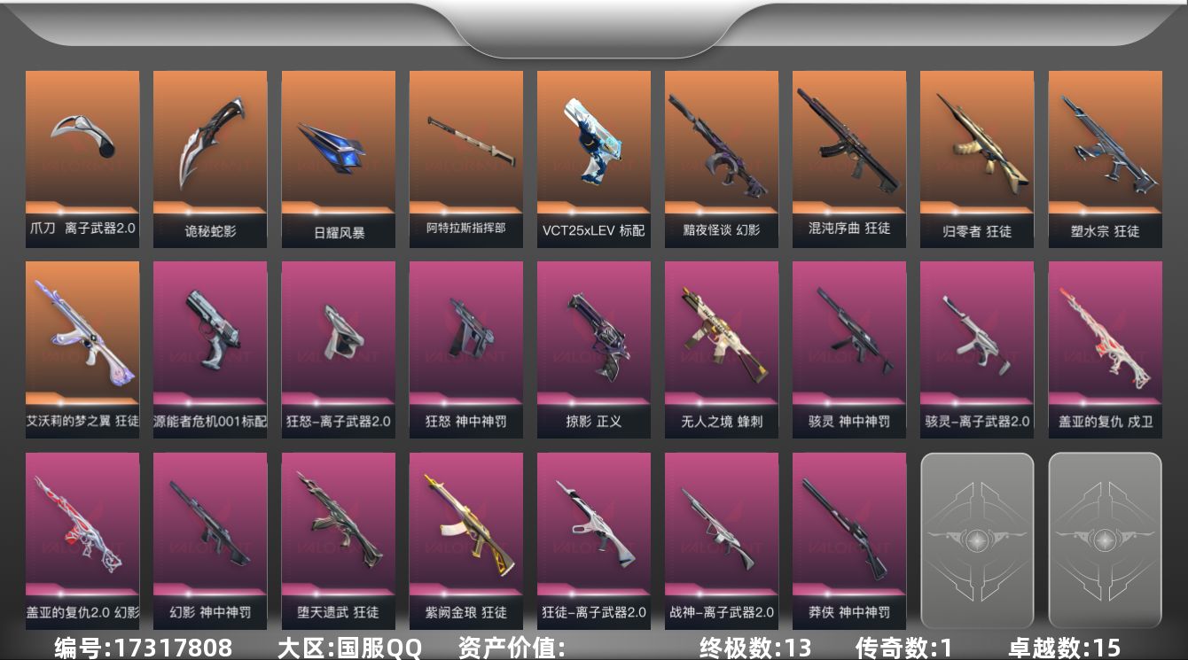 [17317808]【套装】:离子武器//2.0套装,神中神罚套装 【英雄】:幻棱,炼狱,维斯,暮蝶,钛狐,壹决,捷风,雷兹,不死鸟,贤者,猎枭,蝰蛇,零,芮娜,奇乐,斯凯,夜露,K/O,盖可,黑梦,钢锁 【近战武器】:近战武器-神之刃,近战武器-紫金爪刀,近战武器-落英飞旋,近战武器-离子武器//2.0 爪刀,近战武器-天御刀,近战武器-诡秘蛇影 军刀,近战武器-日耀风暴 遗器,近战武器-阿特拉斯指挥部 甩棍 【狂徒】:狂徒-艾沃莉的梦之翼,狂徒-归零者,狂徒-混沌序曲,狂徒-塑水宗,狂徒-堕天遗武,狂徒-紫阙金琅,狂徒-离子武器//2.0,狂徒-诡秘蛇影 【幻影】:幻影-黯夜怪谈,幻影-盖亚的复仇//2.0,幻影-神中神罚,幻影-末日之翼 【戍卫】:戍卫-盖亚的复仇,戍卫-折光棱晶 【獠犬】:獠犬-星航勇进 【冥驹】:冥驹-虎魄春明 【飞将】:飞将-末日之翼 【莽侠】:莽侠-神中神罚,莽侠-诡秘蛇影 【战神】:战神-离子武器//2.0 【奥丁】:奥丁-末日之翼 【判官】:判官-诡秘蛇影 【骇灵】:骇灵-离子武器//2.0,骇灵-神中神罚 【蜂刺】:蜂刺-无人之境,蜂刺-折光棱晶 【标配】:标配-源能者危机001,标配-折光棱晶 【VCT手枪】:标配-VCT25 x LEV 【正义】:正义-掠影 【鬼魅】:鬼魅-诡秘蛇影 【狂怒】:狂怒-离子武器//2.0,狂怒-神中神罚 【短炮】:短炮-末日之翼 【卡面】:热舞环节 卡面,树懒大作战 卡面,红鳞松叶 卡面,沙雕爆能器 卡面,无畏契约GO!第一卷:芮娜 卡面,无畏契约GO!第一卷:零 卡面,无垠星环 卡面,《双城之战》金克丝 卡面,钢锁vs盖可 卡面,代号红色 卡面,新兵报到 卡面,V契约 卡面,无畏契约 卡面 【喷漆】:审判之爪 喷漆,买装还是存钱 喷漆,关门放狗 喷漆,放下武器 喷漆,胜利属于无畏契约 喷漆,GLHF 喷漆,无畏契约 喷漆 【挂饰】:无畏契约GO!第一卷 芮娜 挂饰,薰衣草之心 挂饰,动力机箱 挂饰,招财猫熊 挂饰,天外飞客 挂饰,红鳞松叶 挂饰,《双城之战》魄罗 挂饰,盆栽小友 挂饰,无畏契约 纪念币 挂饰