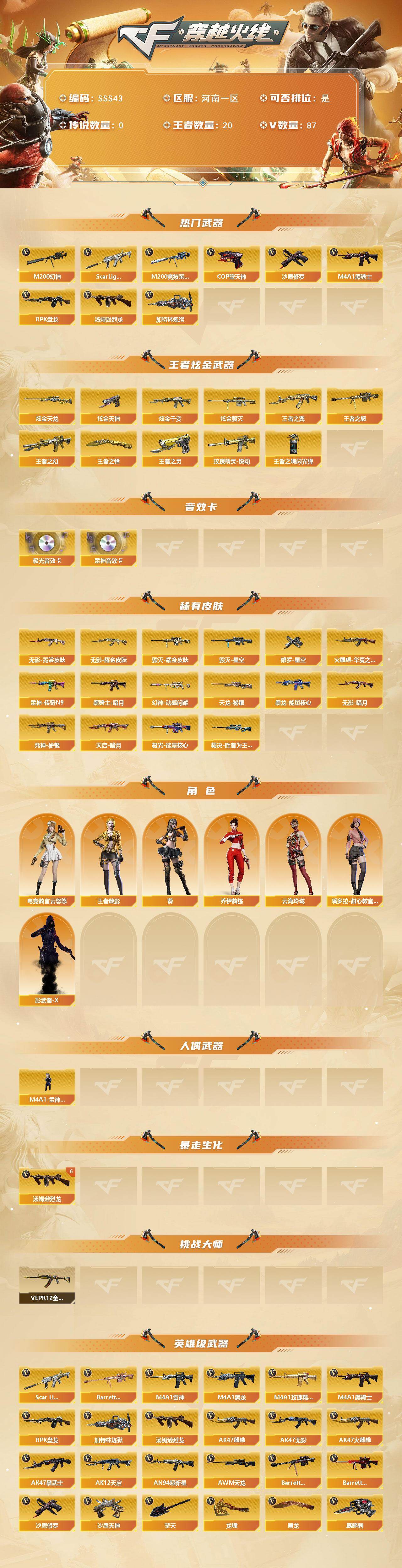 [17317857]河南一区-96V-20王者武器数-6炫金武器数 【热门武器】:Scar Light-白虎,M200-幻神,M200-竞技荣光,M4A1-黑骑士,汤姆逊-烈龙*6,RPK-盘龙*2,加特林-炼狱,COP-堕天神,沙鹰-修罗*2 【王者炫金武器】:王者之幻,王者之翼*2,玫瑰精灵-悦动,王者之怒,王者之灵*4,王者之锋*2,炫金千变,炫金毁灭,炫金天龙*2,炫金天神*2,王者之魄闪光弹 【音效卡】:M4A1-雷神音效卡,Barrett-极光音效卡 【皮肤】:幻神-动感闪耀 皮肤,裁决-胜者为王 皮肤,雷神-传奇N9,火麒麟-华夏之心,毁灭耀金皮肤,毁灭-星空,黑龙-能量核心*3,黑骑士-暗月,无影-暗月*2,无影耀金皮肤*2,无影-霓裳皮肤,死神-秘银,天启-暗月,天龙-秘银,极光-能量核心,修罗-星空 【角色】:葵,电竞教官-云悠悠,王者-魅影,乔伊教练,云海玲珑,潘多拉-甜心教官,影武者-X 【人偶武器】:M4A1-雷神-精英刀锋 【挑战大师】:VEPR-12-金魔 【英雄级武器】:AK47-火麒麟*2,AK47-麒麟,M4A1-黑龙,M4A1-雷神,M4A1-黑骑士,AK47-无影*2,AK47-黑武士,AK12-天启*4,AN94-超新星,M4A1-龙血,Scar Light-白虎,M4A1-玫瑰精灵,M4A1-猎神*2,王者之心-觉醒版,王者之势-觉醒版,黑武士-CF网剧冠军,AWM-天龙*2,Barrett-毁灭*3,Barrett-极光*2,AWM-裁决*3,M200-幻神,Barrett-朱雀,M200-竞技荣光,Barrett-金色蔷薇*2,王者之光-觉醒版,王者之力-觉醒版,王者之决-觉醒版,RPK-盘龙*2,加特林-炼狱,汤姆逊-烈龙*6,AA-12-雷霆*4,沙鹰-修罗*2,沙鹰-天神,COP-堕天神,柯尔特-竞技荣光,天神-动感闪耀,天神-CF网剧冠军,屠龙*6,龙啸,马来剑-夜魔,擎天*2,麒麟刺*3,擎天-竞技荣光,擎天-CF网剧冠军,王者之锋-觉醒版,王者之刺-觉醒版,高爆手雷-夜魔,高爆手雷-竞技荣光*4,手雷-动感闪耀,高爆手雷-云龙,闪光弹-夜魔,闪光弹-竞技荣光*3,烟雾弹-夜魔,烟雾弹-竞技荣光*3,烟雾弹-雷暴王者,M4A1-赤狱骑士 【道具】:战舰背包,背包-葫芦兄弟,绿色巨人,灵魂忍者,迷雾幽灵,夺命之镰,防化服*2,金