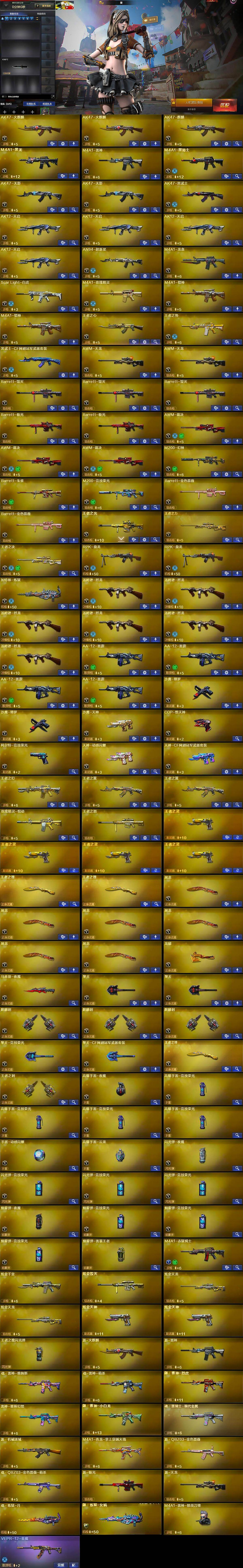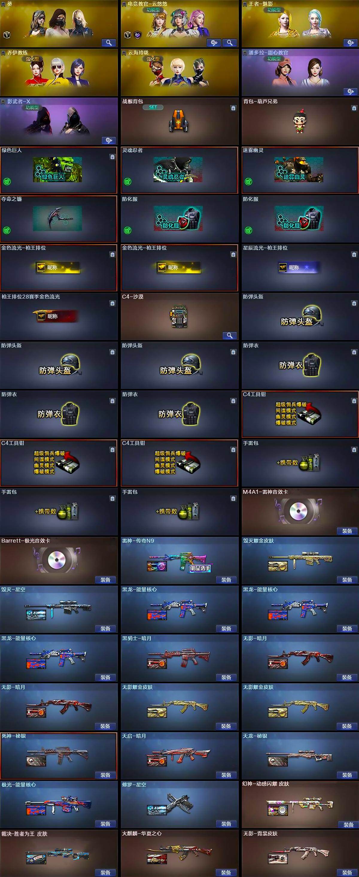 【英雄级武器】:AK47-火麒麟*2,AK47-麒麟,M4A1-黑龙,M4A1-雷神,M4A1-黑骑士,AK47-无影*2,AK47-黑武士,AK12-天启*4,AN94-超新星,M4A1-龙血,Scar Light-白虎,M4A1-玫瑰精灵,M4A1-猎神*2,王者之心-觉醒版,王者之势-觉醒版,黑武士-CF网剧冠军,AWM-天龙*2,Barrett-毁灭*3,Barrett-极光*2,AWM-裁决*3,M200-幻神,Barrett-朱雀,M200-竞技荣光,Barrett-金色蔷薇*2,王者之光-觉醒版,王者之力-觉醒版,王者之决-觉醒版,RPK-盘龙*2,加特林-炼狱,汤姆逊-烈龙*6,AA-12-雷霆*4,沙鹰-修罗*2,沙鹰-天神,COP-堕天神,柯尔特-竞技荣光,天神-动感闪耀,天神-CF网剧冠军,屠龙*6,龙啸,马来剑-夜魔,擎天*2,麒麟刺*3,擎天-竞技荣光,擎天-CF网剧冠军,王者之锋-觉醒版,王者之刺-觉醒版,高爆手雷-夜魔,高爆手雷-竞技荣光*4,手雷-动感闪耀,高爆手雷-云龙,闪光弹-夜魔,闪光弹-竞技荣光*3,烟雾弹-夜魔,烟雾弹-竞技荣光*3,烟雾弹-雷暴王者,M4A1-赤狱骑士