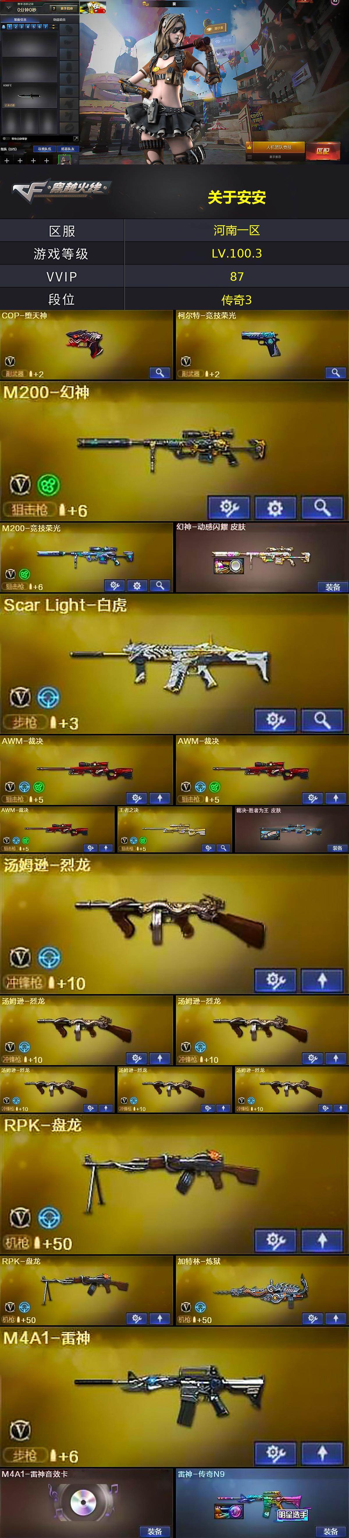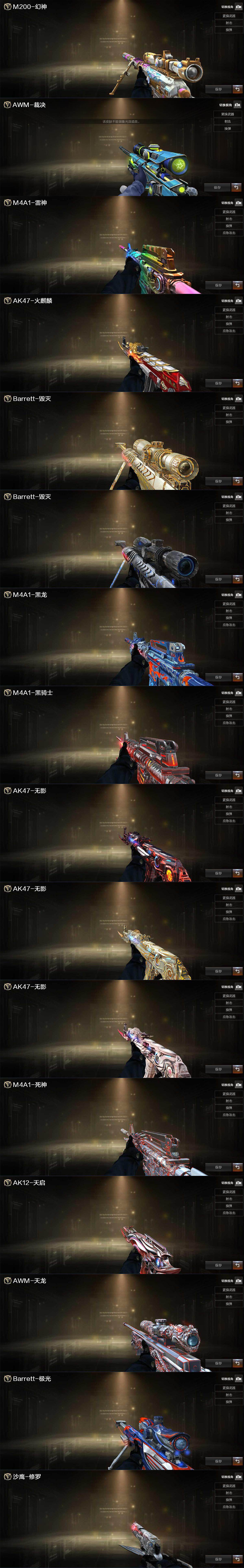 【热门武器】:Scar Light-白虎,M200-幻神,M200-竞技荣光,M4A1-黑骑士,汤姆逊-烈龙*6,RPK-盘龙*2,加特林-炼狱,COP-堕天神,沙鹰-修罗*2