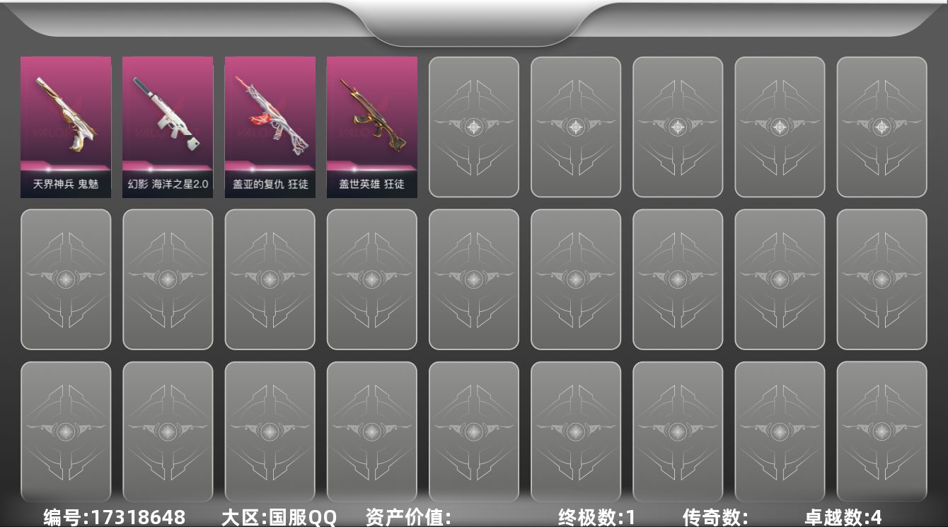 [17318648]【英雄】:炼狱,维斯,暮蝶,壹决,铁臂,捷风,雷兹,幽影,不死鸟,贤者,猎枭,蝰蛇,零,芮娜,奇乐,尚勃勒,霓虹,斯凯,夜露,海神,盖可,钢锁 【近战武器】:近战武器-穿花蝴蝶 【狂徒】:狂徒-盖世英雄,狂徒-盖亚的复仇 【幻影】:幻影-海洋之星//2.0 【鬼魅】:鬼魅-天界神兵 【卡面】:树懒大作战 卡面,Clutch 卡面,无畏契约GO!第一卷:芮娜 卡面,无畏契约GO!第一卷:零 卡面,无垠星环 卡面,《双城之战》金克丝 卡面,无畏契约GO!第一卷:贤者 卡面,代号红色 卡面,新兵报到 卡面,V契约 卡面,无畏契约 卡面 【喷漆】:买装还是存钱 喷漆,关门放狗 喷漆,无畏契约GO!第一卷:芮娜 喷漆,放下武器 喷漆,胜利属于无畏契约 喷漆,GLHF 喷漆,无畏契约 喷漆 【挂饰】:薰衣草之心 挂饰,动力机箱 挂饰,天外飞客 挂饰,红鳞松叶 挂饰,《双城之战》魄罗 挂饰,海豹的认可 挂饰,无畏契约 纪念币 挂饰