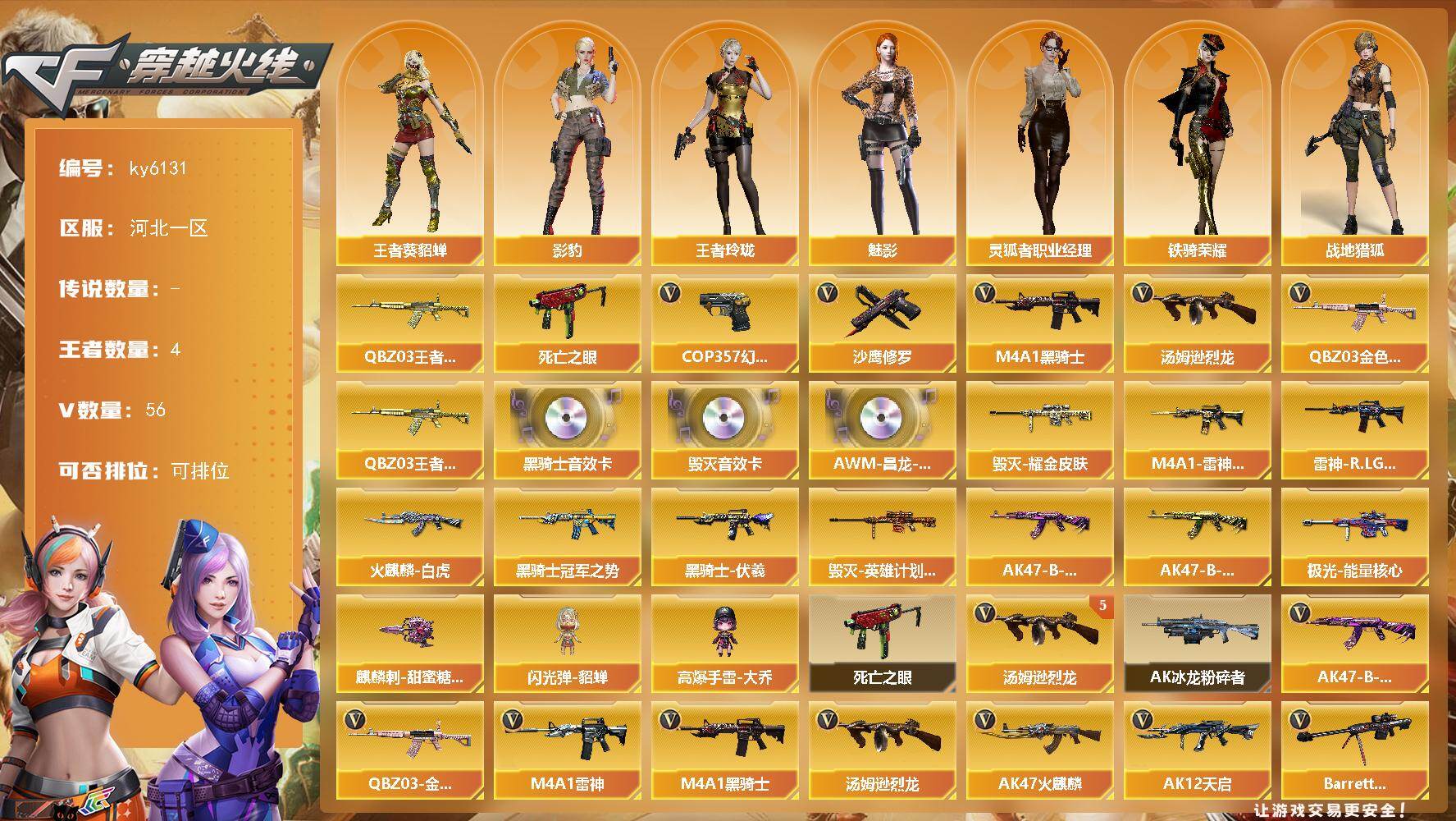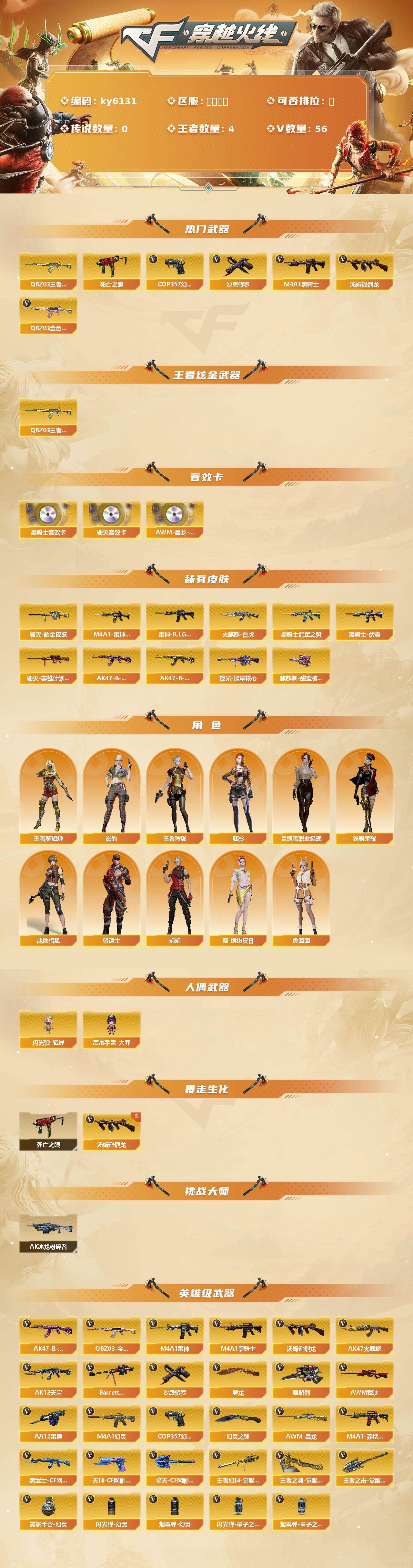 [17320494]河北一区-61V-4王者武器数-0炫金武器数 【热门武器】:QBZ03-金色蔷薇,QBZ-03-王者蔷薇,死亡之眼,M4A1-黑骑士,汤姆逊-烈龙*5,COP 357-幻灵*2,沙鹰-修罗*4 【王者炫金武器】:QBZ-03-王者蔷薇 【音效卡】:M4A1-黑骑士音效卡,Barrett-毁灭音效卡,AWM-昌龙-怀旧音效卡 【皮肤】:M4A1-雷神-CFS 2019,雷神-R.LGD-CFPLS18冠军,火麒麟-白虎,毁灭耀金皮肤,毁灭-英雄计划 皮肤,黑骑士-冠军之势,黑骑士-伏羲,AK47-B-常胜将军-曹操,AK47-B-常胜将军-孙权*2,极光-能量核心,麒麟刺-甜蜜糖果 皮肤 【角色】:魅影,影豹,战地猎狐,王者-葵-貂蝉,王者玲珑,修道士,娟娟,灵狐者-职业经理,铁骑荣耀,兔囡囡,樱-缤纷夏日 【人偶武器】:闪光弹-貂蝉,高爆手雷-大乔 【暴走生化】:死亡之眼 【挑战大师】:AK47-冰龙粉碎者 【英雄级武器】:AK47-火麒麟,M4A1-雷神,M4A1-黑骑士,AK12-天启,M4A1-幻灵,QBZ03-金色蔷薇,AK47-B-常胜将军,黑武士-CF网剧冠军,机械迷城-穹宇,Barrett-毁灭,AWM-裁决,王者幻神-觉醒版,汤姆逊-烈龙*5,AA-12-雷霆,沙鹰-修罗*4,COP 357-幻灵*2,天神-CF网剧冠军,屠龙,麒麟刺,幻灵之锋,擎天-CF网剧冠军,王者之啸-觉醒版,王者之击-觉醒版,高爆手雷-幻灵*7,闪光弹-幻灵*6,闪光弹-量子之心,烟雾弹-幻灵*5,烟雾弹-量子之心,M4A1-赤狱骑士,AWM-昌龙 【道具】:BS战队炫彩背包,Q9战队炫彩背包,亚洲杯纪念炫彩背包,炫彩背包,超级背包,女皇终结者-魔龙之吻,救世主-黑桃战神,绿色巨人,灵魂忍者,变异宝贝,迷雾幽灵,夺命之镰,防化服*3,枪王排位29赛季金色流光,防弹头盔*3,防弹衣*3,C4工具钳*3,手雷包*3 【特殊枪械】:1黑骑士,5烈龙