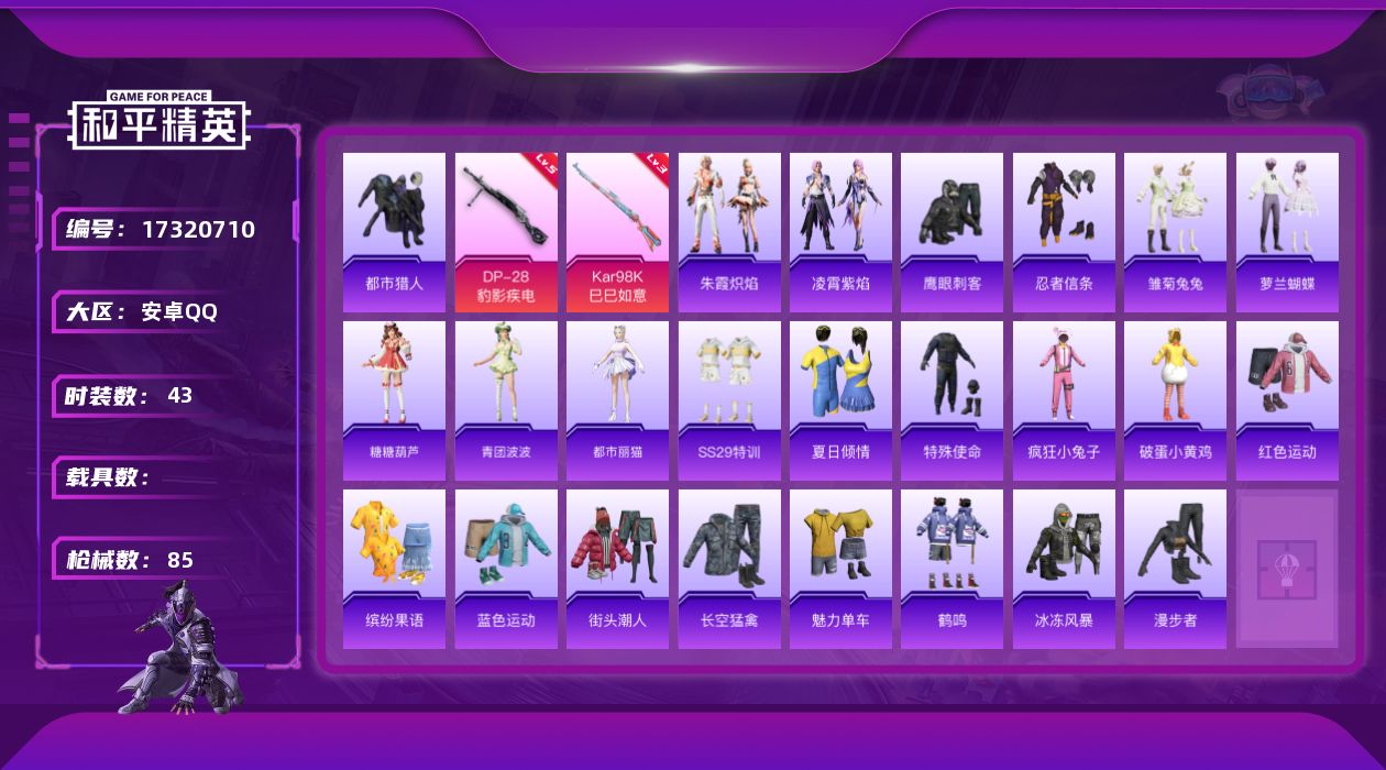 [17320710]安卓 手Q-0粉装-6特效枪-0载具-0粉色飞行器-20452热力值-2王牌印记-43套装-85枪皮