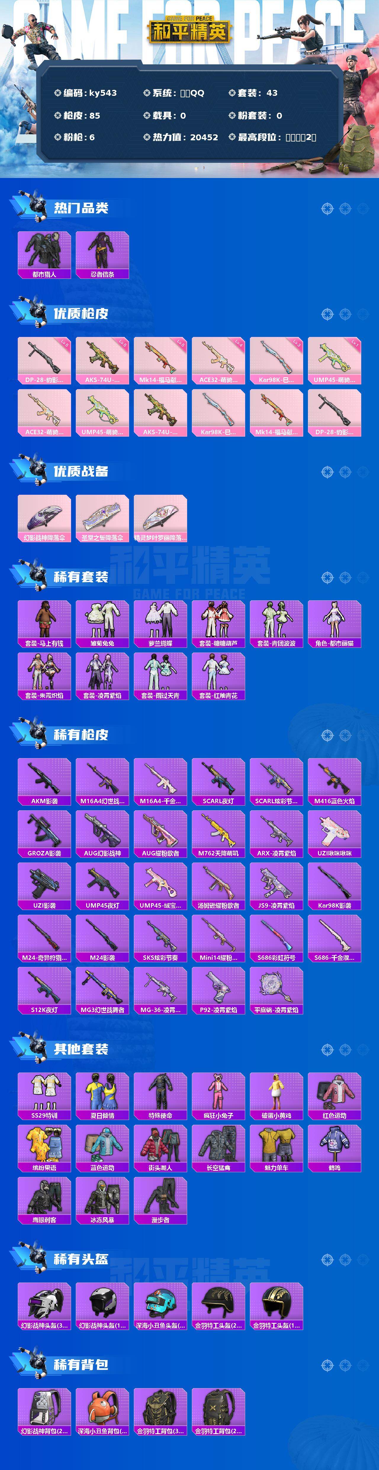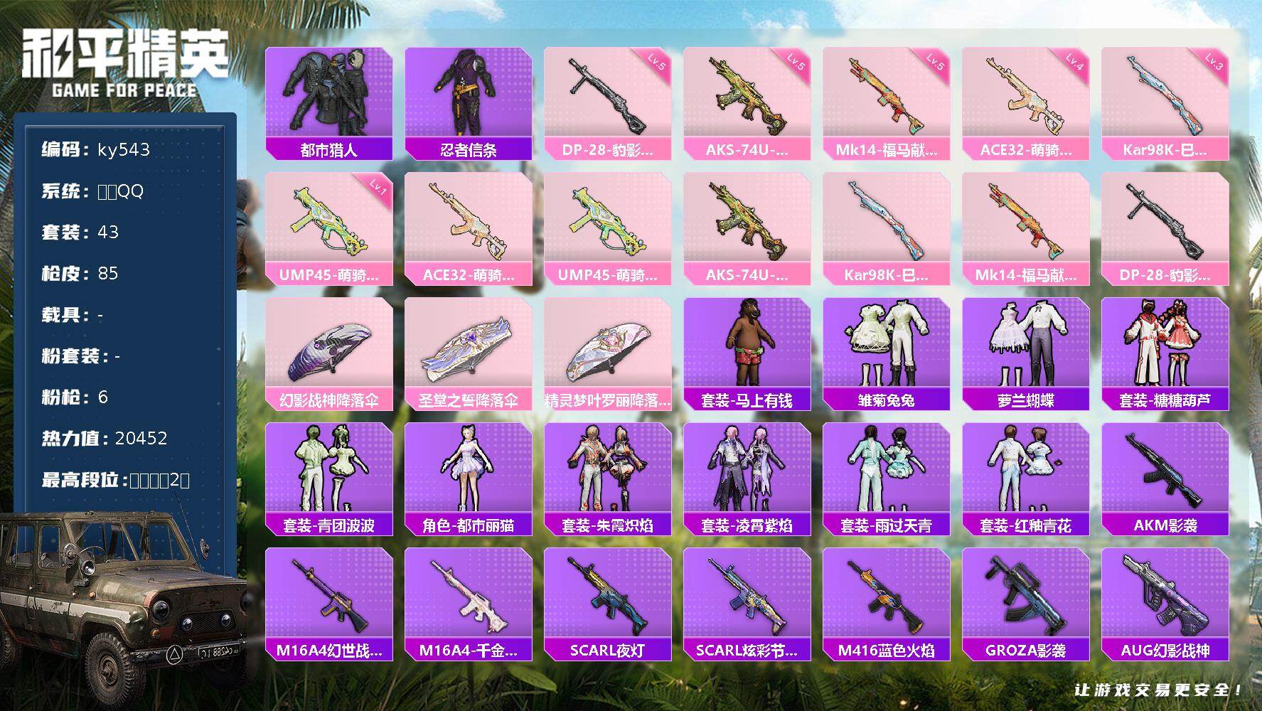 [17320710]安卓 手Q-0粉装-6特效枪-0载具-0粉色飞行器-20452热力值-2王牌印记-43套装-85枪皮 【热门品类】:套装-都市猎人,套装-忍者信条 【粉色枪皮等级】:ACE32-萌骑漫游(四级),UMP45-萌骑冒险(一级),AKS-74U-森灵之息(五级),Kar98K-巳巳如意(三级),Mk14-福马献瑞(五级),DP-28-豹影疾电(五级) 【粉色枪皮】:ACE32-萌骑漫游,UMP45-萌骑冒险,AKS-74U-森灵之息,Kar98K-巳巳如意,Mk14-福马献瑞,DP-28-豹影疾电 【粉色降落伞】:幻影战神降落伞,圣堂之誓降落伞,精灵梦叶罗丽降落伞 【稀有套装】:套装-马上有钱,套装-雏菊兔兔,套装-萝兰蝴蝶,套装-糖糖葫芦,套装-青团波波,角色-都市丽猫,套装-朱霞炽焰,套装-凌霄紫焰,套装-雨过天青,套装-红釉青花 【稀有枪皮】:AKM-影袭,M16A4-幻世战舞者,M16A4-千金淑猫,SCAR-L-夜灯,SCAR-L-炫彩节奏,M416-蓝色火焰,GROZA-影袭,AUG-幻影战神,AUG-耀粉歌者,M762-天降萌叽,ARX-凌霄紫焰,UZI-啾咪啾咪,UZI-影袭,UMP45-夜灯,UMP45-绒宝小鹅,汤姆逊-耀粉歌者,JS9-凌霄紫焰,Kar98K-影袭,M24-影袭,M24-奇异狩猎者,SKS-炫彩节奏,Mini14-耀粉歌者,S686-彩虹符号,S686-千金淑猫,S12K-夜灯,MG3-幻世战舞者,MG-36-凌霄紫焰,P92-凌霄紫焰,平底锅-凌霄紫焰 【其他套装】:套装-SS29特训,套装-夏日倾情,套装-特殊使命,套装-疯狂小兔子,套装-破蛋小黄鸡,套装-红色运动,套装-缤纷果语,套装-蓝色运动,套装-街头潮人,套装-长空猛禽,套装-魅力单车,套装-鹤鸣,套装-鹰眼刺客,套装-冰冻风暴,套装-漫步者 【稀有头盔】:幻影战神头盔(3级),幻影战神头盔(1级),深海小丑鱼头盔(3级),金羽特工头盔(2级),金羽特工头盔(1级) 【稀有背包】:幻影战神背包(2级),深海小丑鱼背包(2级),金羽特工背包(3级),金羽特工背包(2级) 【营地ID】:974342527