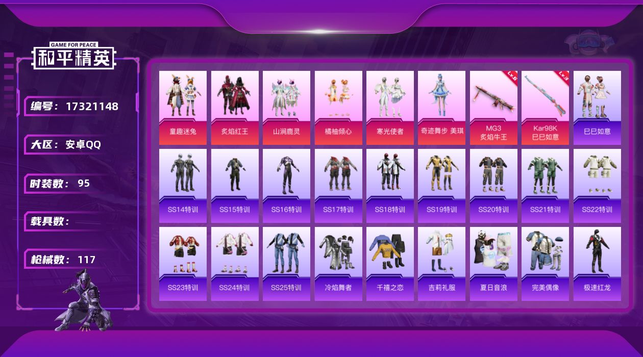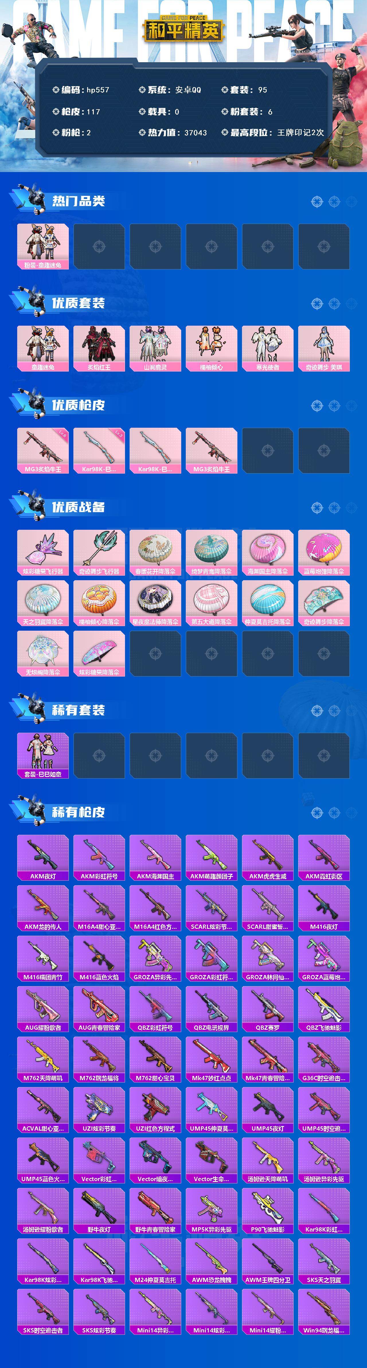 [17321148]安卓 手Q-6粉装-2特效枪-0载具-2粉色飞行器-37043热力值-2王牌印记-95套装-117枪皮 【热门品类】:粉装-童趣迷兔 【粉色套装】:粉装-童趣迷兔,粉装-炙焰红王,粉装-山涧鹿灵,粉装-橘柚倾心,粉装-寒光使者,角色-奇迹舞步 美琪 【粉色枪皮等级】:Kar98K-巳巳如意(三级),MG3-炙焰牛王(六级) 【粉色枪皮】:Kar98K-巳巳如意,MG3-炙焰牛王 【粉色飞行器】:炫彩糖果飞行器,奇迹舞步飞行器 【粉色降落伞】:春暖花开降落伞,绮梦青鸾降落伞,海渊国主降落伞,蓝莓炮弹降落伞,天之羽翼降落伞,橘柚倾心降落伞,星夜魔法师降落伞,第五大道降落伞,仲夏莫吉托降落伞,奇迹舞步降落伞,无垠阁降落伞,炫彩糖果降落伞 【稀有套装】:套装-巳巳如意 【稀有枪皮】:AUG-冰晶雪宝,AKM-夜灯,AKM-彩虹符号,AKM-海渊国主,AKM-萌趣颜团子,AKM-虎虎生威,AKM-霓虹街区,AKM-龙的传人,M16A4-甜心亚梦,M16A4-红色方程式,SCAR-L-炫彩节奏,SCAR-L-甜蜜誓约,M416-夜灯,M416-糯团青竹,M416-蓝色火焰,GROZA-异彩先驱,GROZA-彩虹符号,GROZA-林间仙鹿,GROZA-蓝莓炮弹,AUG-耀粉歌者,AUG-青春冒险家,QBZ-彩虹符号,QBZ-电玩视界,QBZ-赛罗,QBZ-飞驰魅影,M762-天降萌叽,M762-瑞龙福将,M762-甜心宝贝,Mk47-妙红点点,Mk47-青春冒险家,G36C-时空追击者,AC-VAL-甜心亚梦,UZI-炫彩节奏,UZI-红色方程式,UMP45-仲夏莫吉托,UMP45-夜灯,UMP45-时空追击者,UMP45-蓝色火焰,Vector-彩虹符号,Vector-暗夜玫瑰,Vector-生命誓言,汤姆逊-天降萌叽,汤姆逊-异彩先驱,汤姆逊-耀粉歌者,野牛-夜灯,野牛-青春冒险家,MP5K-异彩先驱,P90-飞驰魅影,Kar98K-彩虹符号,Kar98K-炫彩节奏,Kar98K-飞驰魅影,M24-仲夏莫吉托,AWM-恐龙拽拽,AWM-王牌四分卫,SKS-天之羽翼,SKS-时空追击者,SKS-炫彩节奏,Mini14-异彩先驱,Mini14-炫彩节奏,Mini14-耀粉歌者,Win94-瑞龙福将,QBU-青春冒险家,QBU-飒粉甜心,AMR-妙红点点,M200-仲夏莫吉托,S