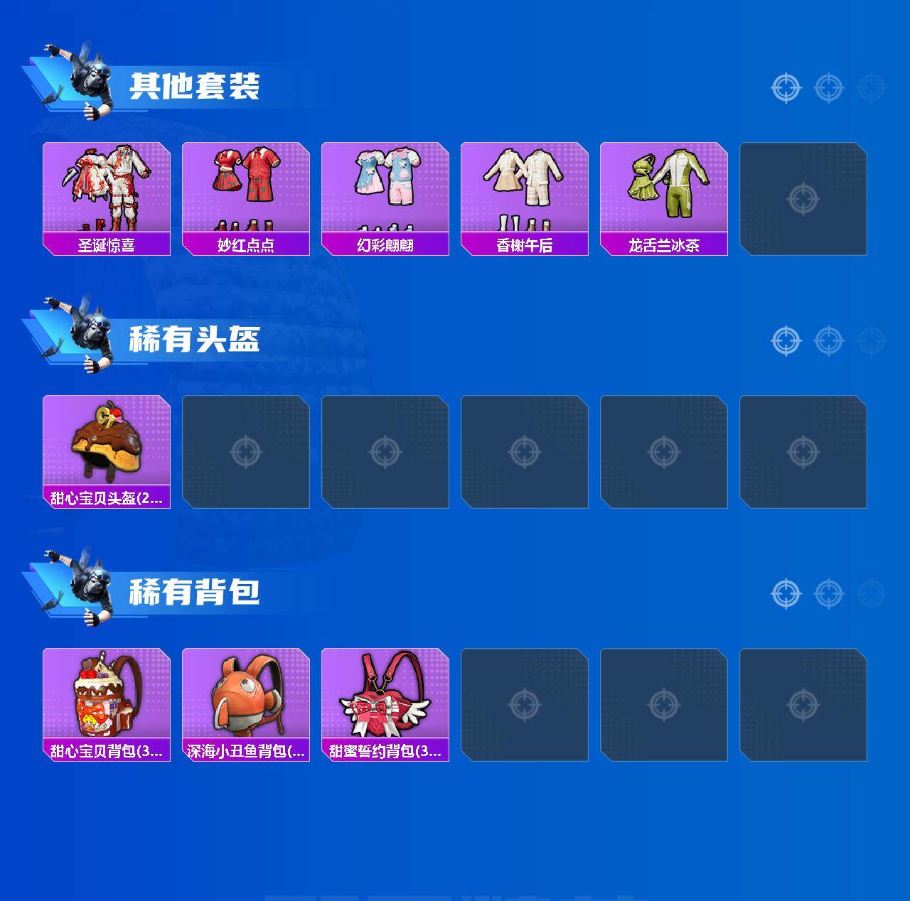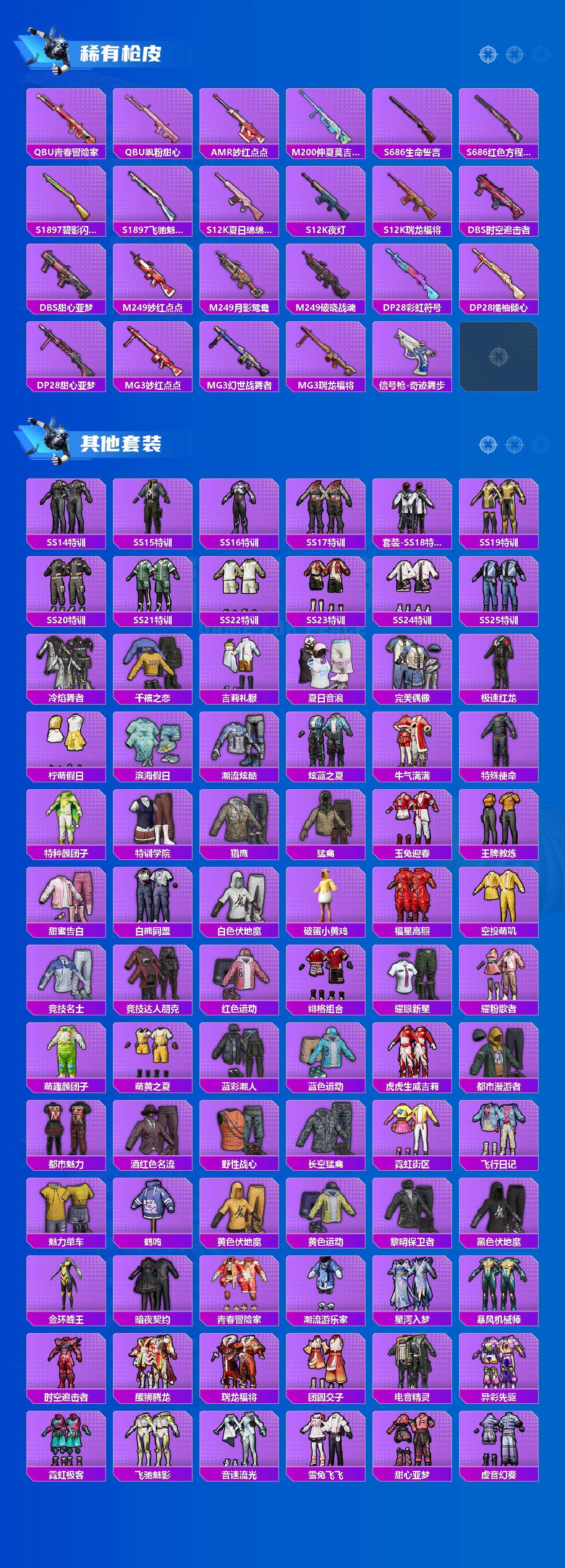 【稀有枪皮】:AUG-冰晶雪宝,AKM-夜灯,AKM-彩虹符号,AKM-海渊国主,AKM-萌趣颜团子,AKM-虎虎生威,AKM-霓虹街区,AKM-龙的传人,M16A4-甜心亚梦,M16A4-红色方程式,SCAR-L-炫彩节奏,SCAR-L-甜蜜誓约,M416-夜灯,M416-糯团青竹,M416-蓝色火焰,GROZA-异彩先驱,GROZA-彩虹符号,GROZA-林间仙鹿,GROZA-蓝莓炮弹,AUG-耀粉歌者,AUG-青春冒险家,QBZ-彩虹符号,QBZ-电玩视界,QBZ-赛罗,QBZ-飞驰魅影,M762-天降萌叽,M762-瑞龙福将,M762-甜心宝贝,Mk47-妙红点点,Mk47-青春冒险家,G36C-时空追击者,AC-VAL-甜心亚梦,UZI-炫彩节奏,UZI-红色方程式,UMP45-仲夏莫吉托,UMP45-夜灯,UMP45-时空追击者,UMP45-蓝色火焰,Vector-彩虹符号,Vector-暗夜玫瑰,Vector-生命誓言,汤姆逊-天降萌叽,汤姆逊-异彩先驱,汤姆逊-耀粉歌者,野牛-夜灯,野牛-青春冒险家,MP5K-异彩先驱,P90-飞驰魅影,Kar98K-彩虹符号,Kar98K-炫彩节奏,Kar98K-飞驰魅影,M24-仲夏莫吉托,AWM-恐龙拽拽,AWM-王牌四分卫,SKS-天之羽翼,SKS-时空追击者,SKS-炫彩节奏,Mini14-异彩先驱,Mini14-炫彩节奏,Mini14-耀粉歌者,Win94-瑞龙福将,QBU-青春冒险家,QBU-飒粉甜心,AMR-妙红点点,M200-仲夏莫吉托,S